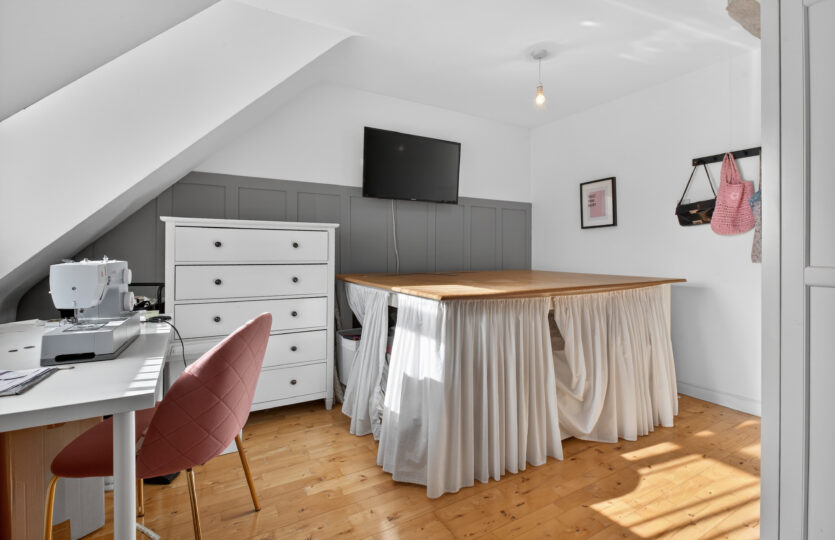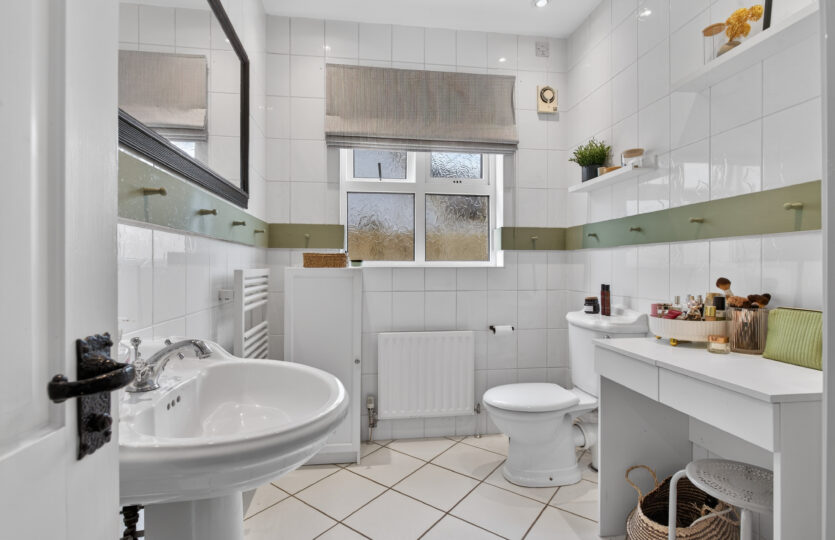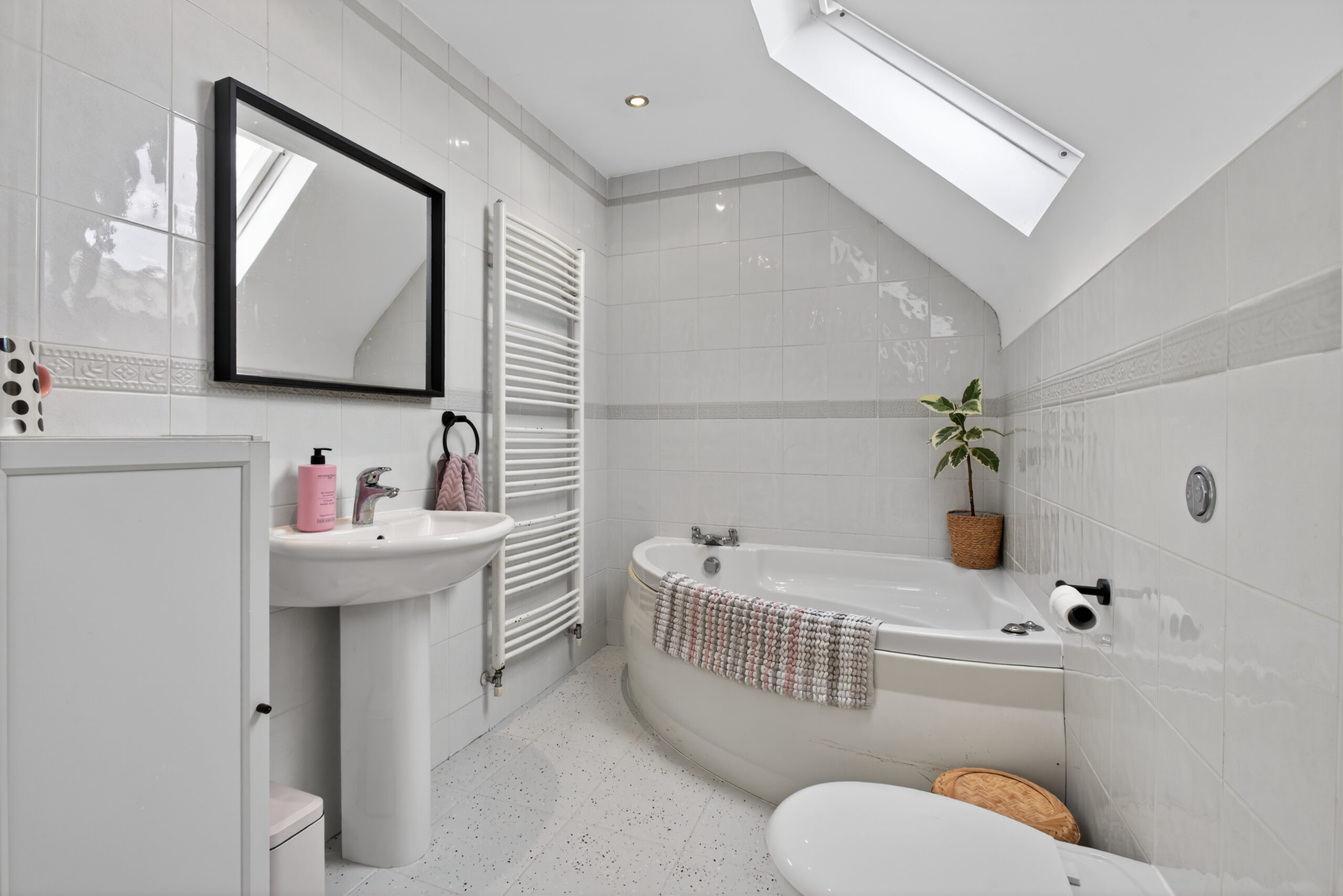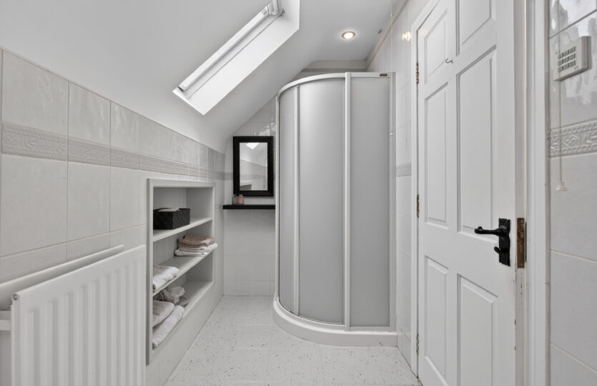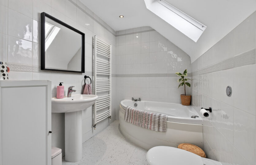 Four piece suite comprising of corner bath, pedestal wash hand basin, low flush wc, quadrant shower cubicle with Triton electric shower, tiled walls and flooring, radiators, recessed ceiling lights, velux windows to rear