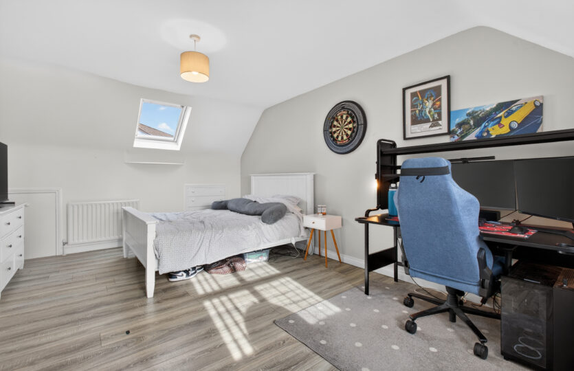 Velux window to rear, uPVC double glazed window to front, radiator, laminated flooring, fitted chest of drawers, access to eaves storage