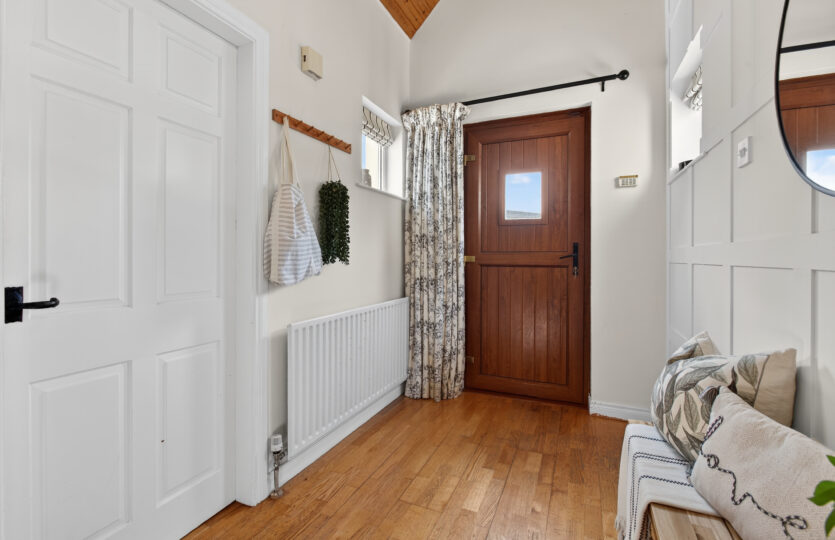 uPVC double glazed door to front, radiator, wooden flooring, uPVC double glazed windows to sides, part vaulted ceiling, panelling to one wall, under stairs storage cupboard and hot press