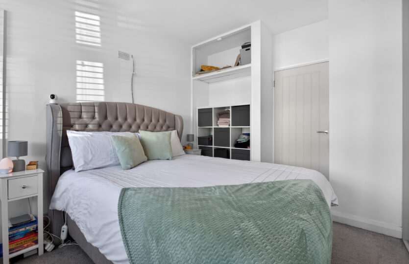 Original herringbone wooden flooring, radiator, recessed LED ceiling lightings, built in storage cupboard, access to roof space via ladder