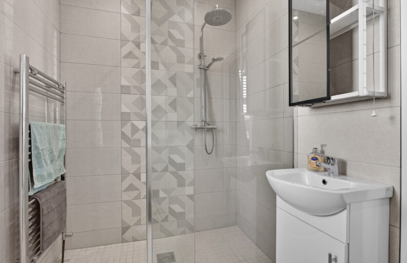 Walk in shower with thermostatic hand held and rainfall shower, wash hand basin with mixer tap set on vanity unit, low flush wc, part tiled walls, tiled flooring, radiator towel rail, uPVC double glazed windows to front and side, recessed LED ceiling lighting