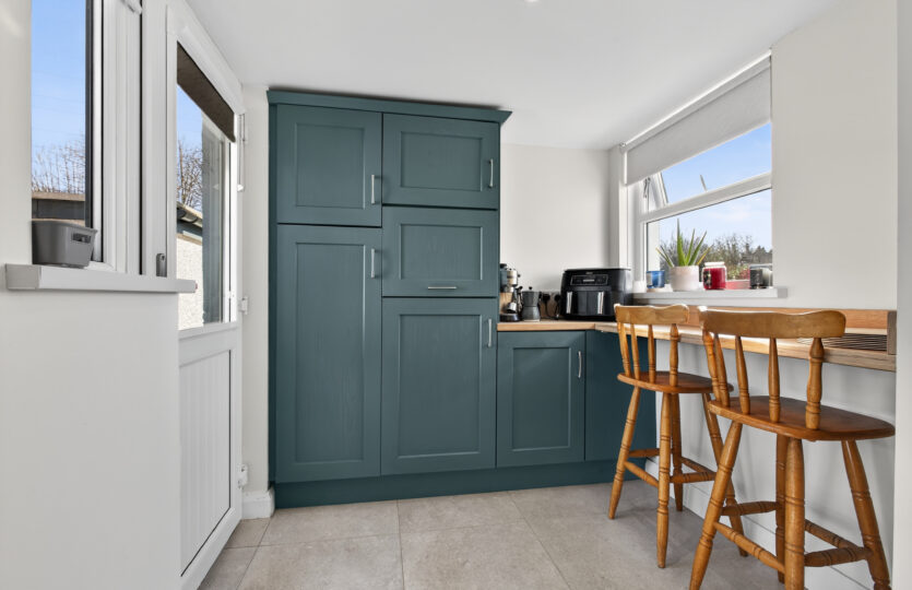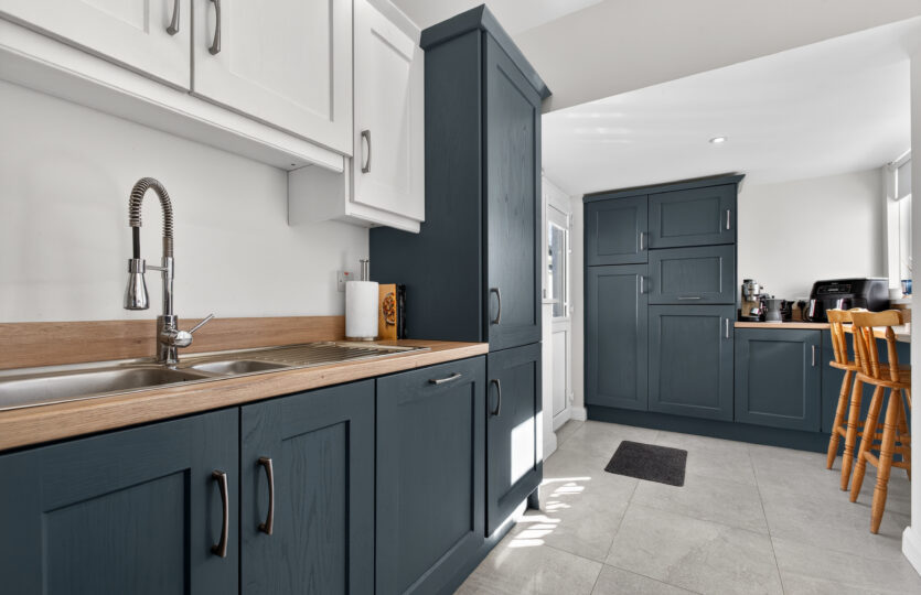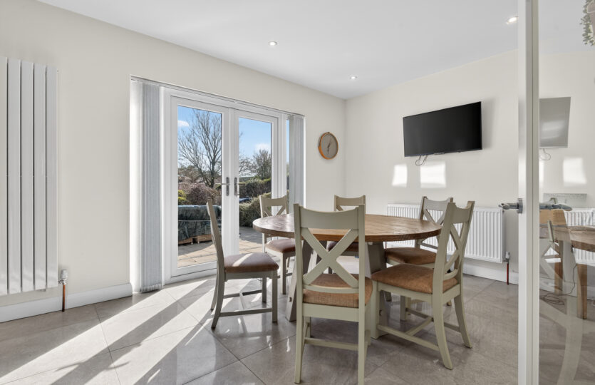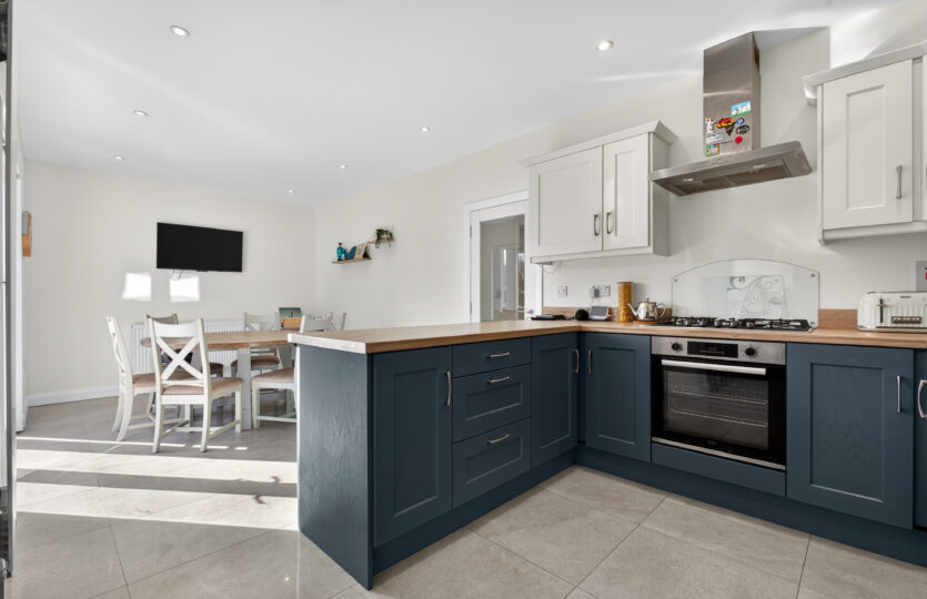 Range of modern eye and low level units with integrated dishwasher, fridge freezer, 5 ring gas hob,     electric oven, stainless steel hood, glass splashback, space for microwave, wood effect work surface with matching upstand, breakfast bar, stainless steel 1 1/4 sink with mixer tap, tiled flooring, radiator, recessed LED ceiling lighting, uPVC double glazed French doors to rear with side windows, additional uPVC double glazed door to side with uPVC double glazed window