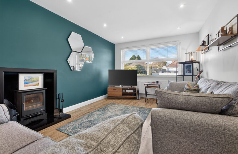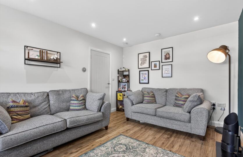 uPVC double glazed window to front, radiator, laminated wooden flooring, multi fuel stove set on steel hearth, recessed LED lighting, TV and telephone points