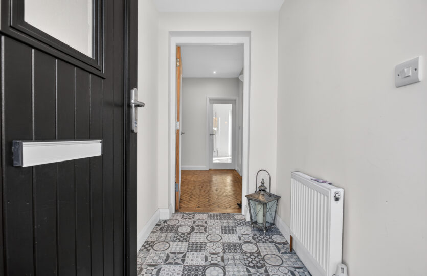 Tiled flooring, radiator, uPVC double glazed door to front with double glazed side window, recessed LED light, glazed door to hallway