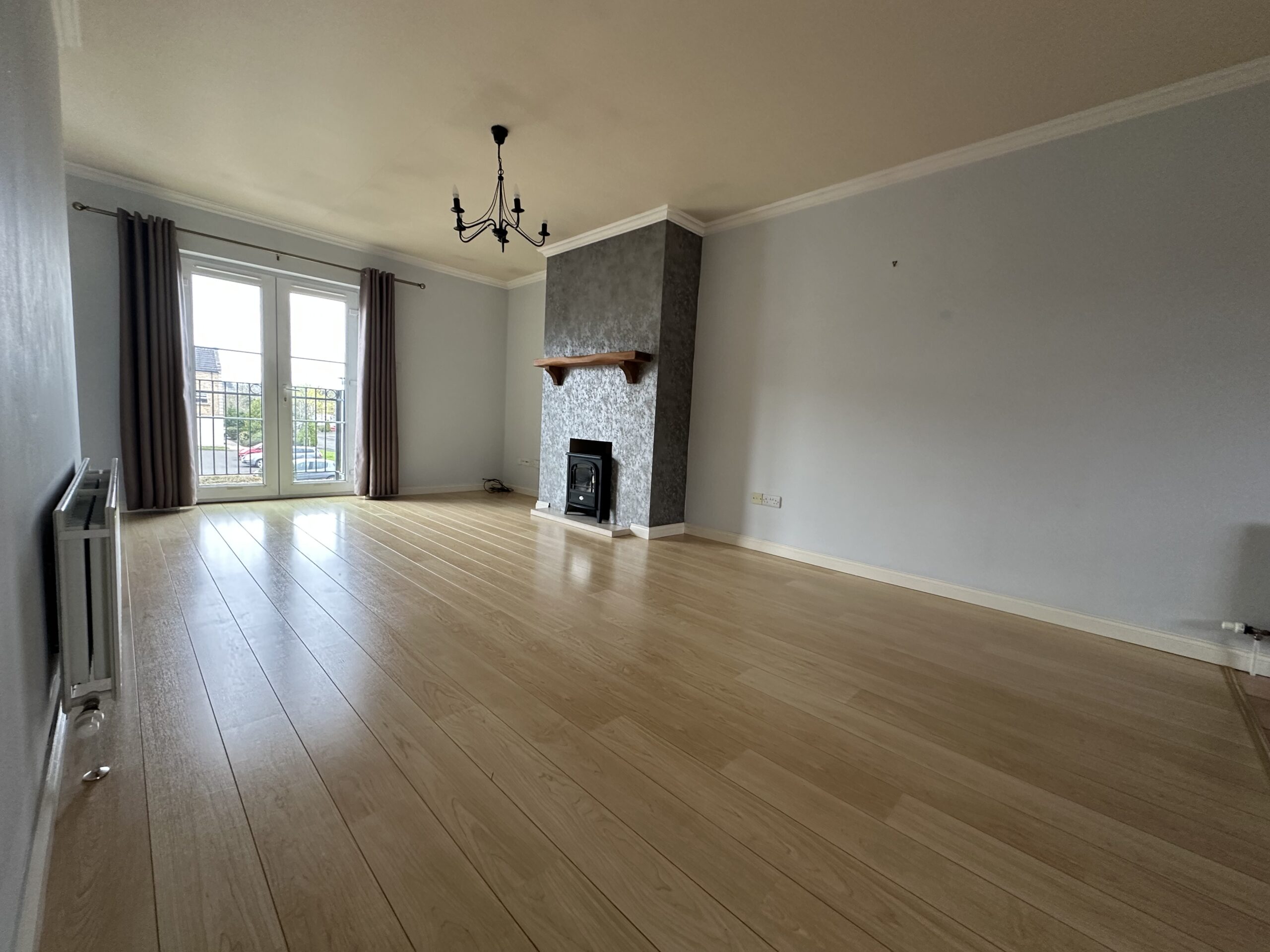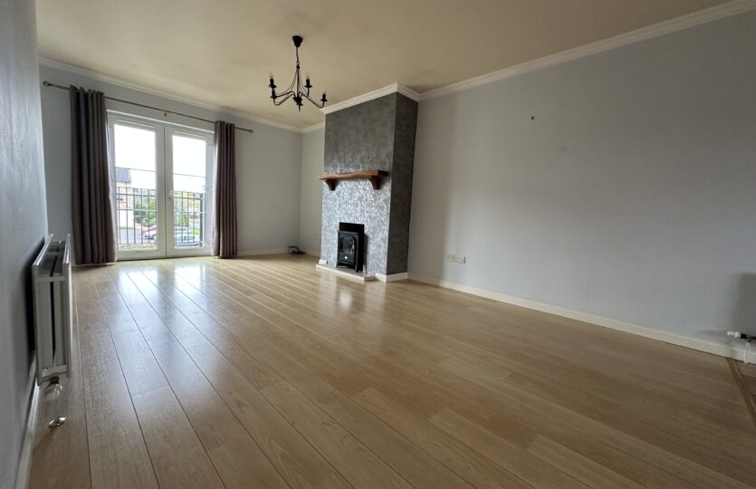 - Lounge – Exceptionally large living space featuring laminated wooden flooring, French doors leading to a private balcony, and a stylish hole-in-the-wall fireplace with an electric stove-style fire and oak mantel