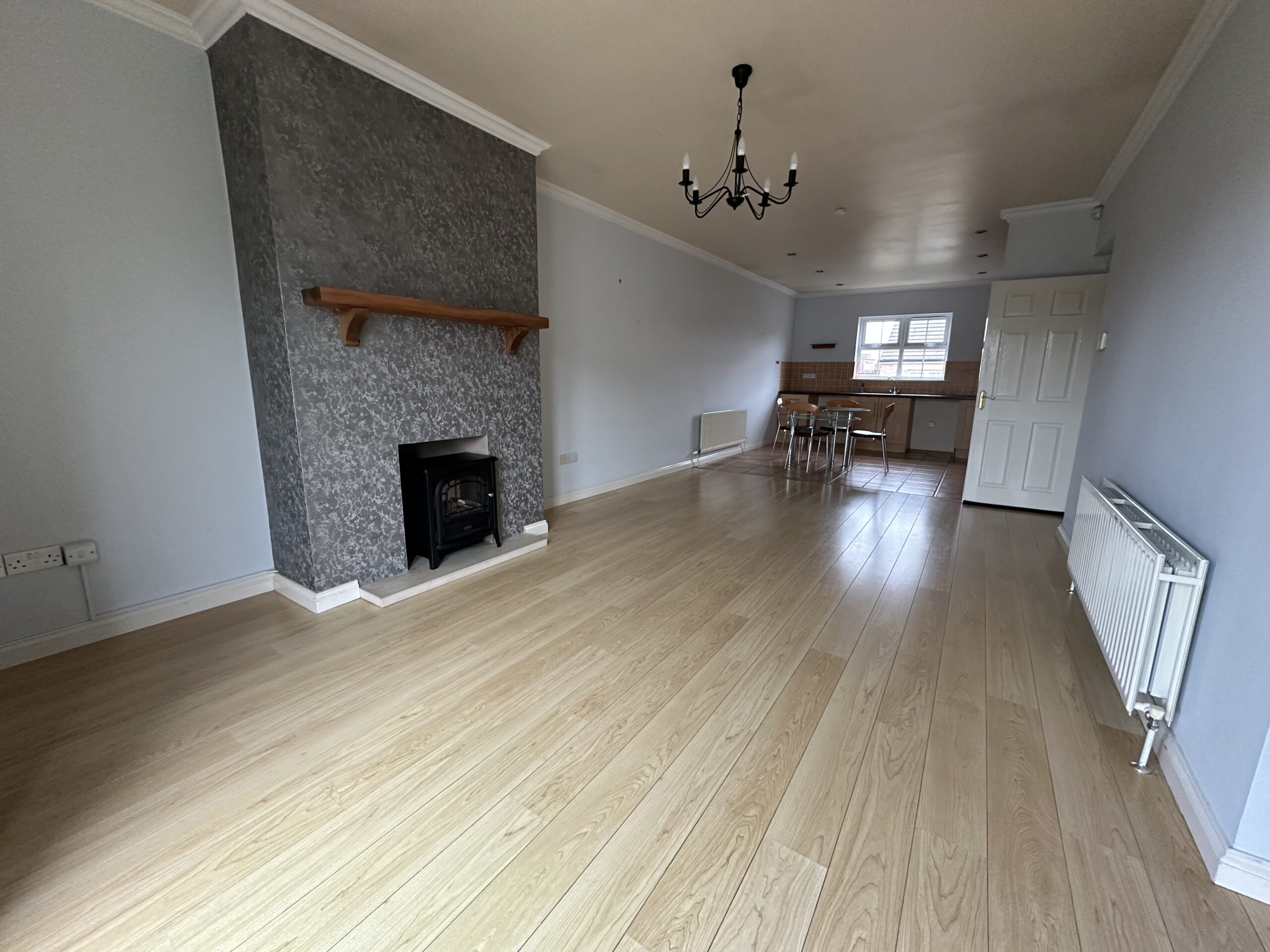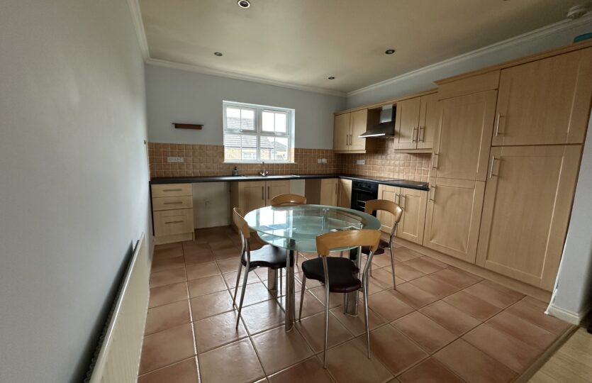 - Kitchen / Dining Area – Spacious open-plan layout with tiled flooring, a range of high and low-level units with contrasting laminated worktops, stainless steel sink, newly fitted integrated ceramic hob and oven, integrated larder fridge freezer, and plumbing for both washing machine and dishwasher