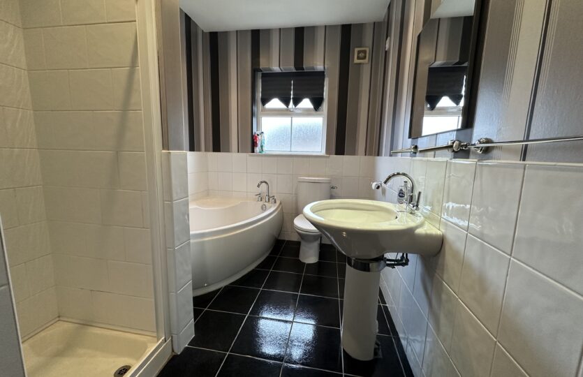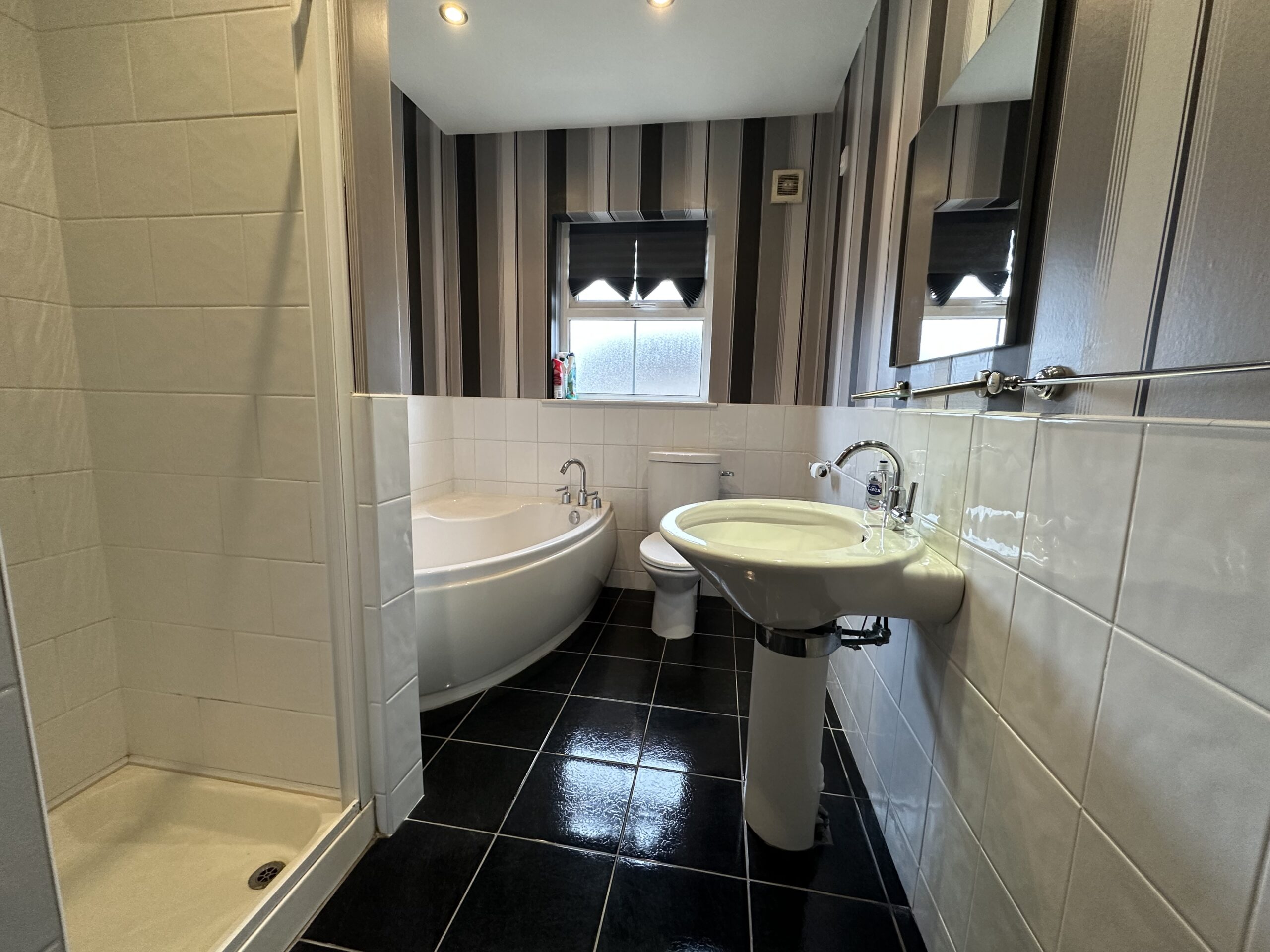 - Bathroom – Well-appointed with tiled flooring, partially tiled walls, a white suite featuring a corner bath, and a separate step-in shower cubicle with thermostatic shower