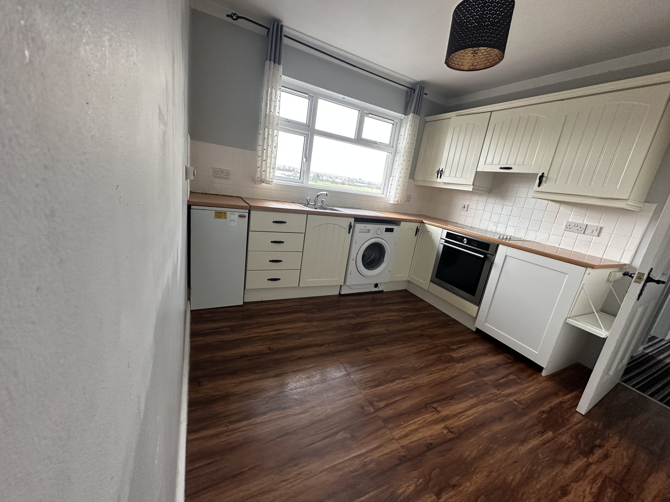 - Kitchen – Fitted with a range of high and low-level cream units, integrated hob and oven, and wood-effect vinyl flooring