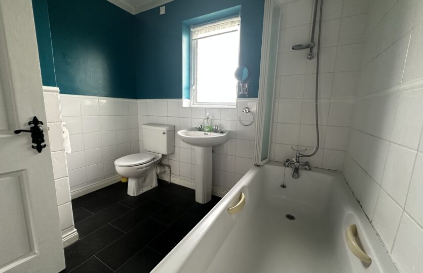 - Bathroom – Equipped with a three-piece white suite, over-bath shower attachment, and tile-effect vinyl flooring