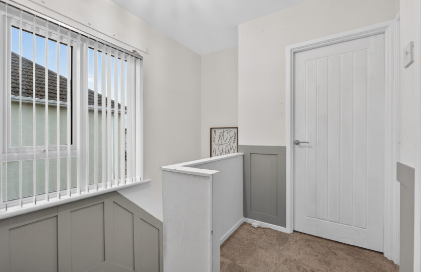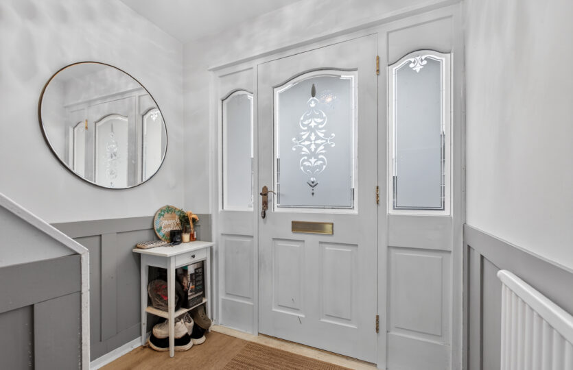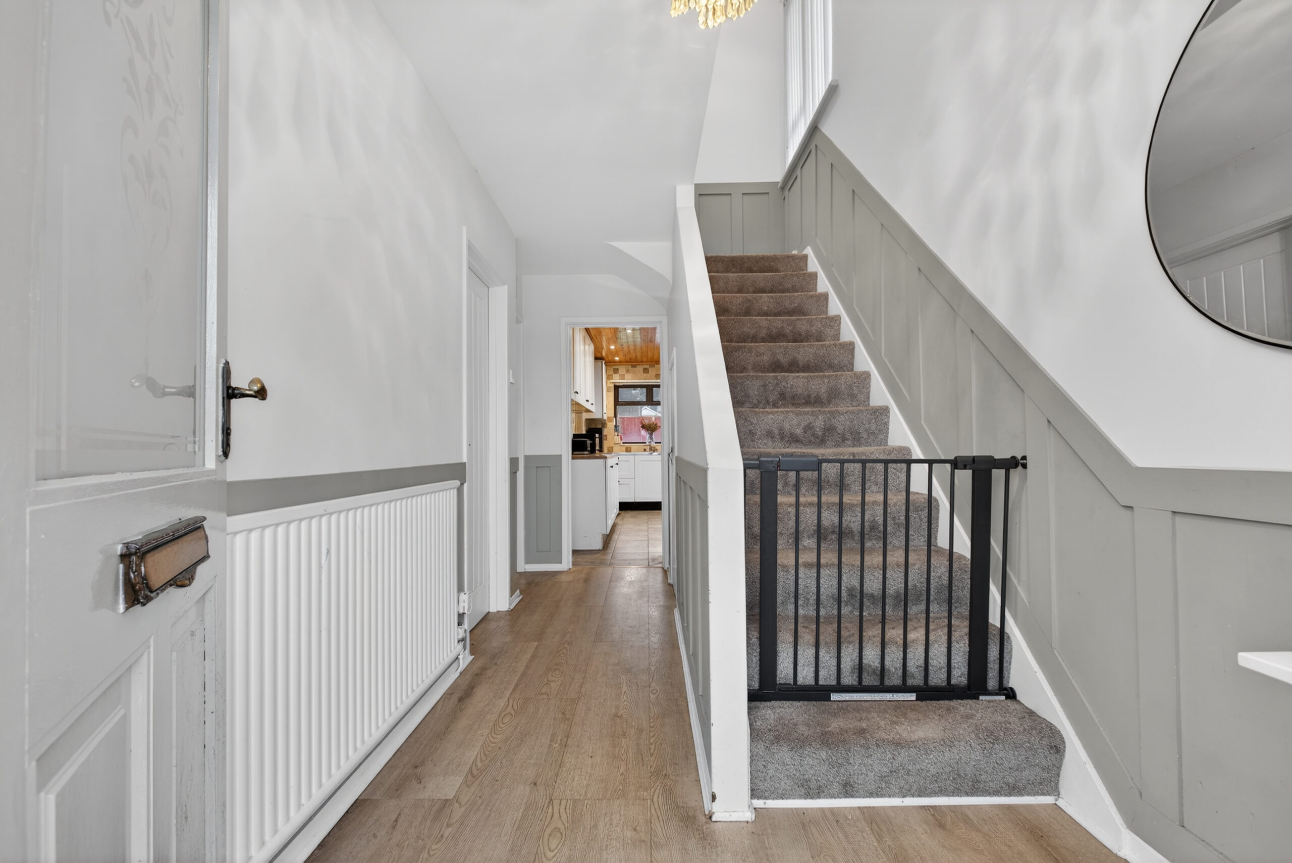 Wide plank wood effect flooring, half panelled walls, understairs storage