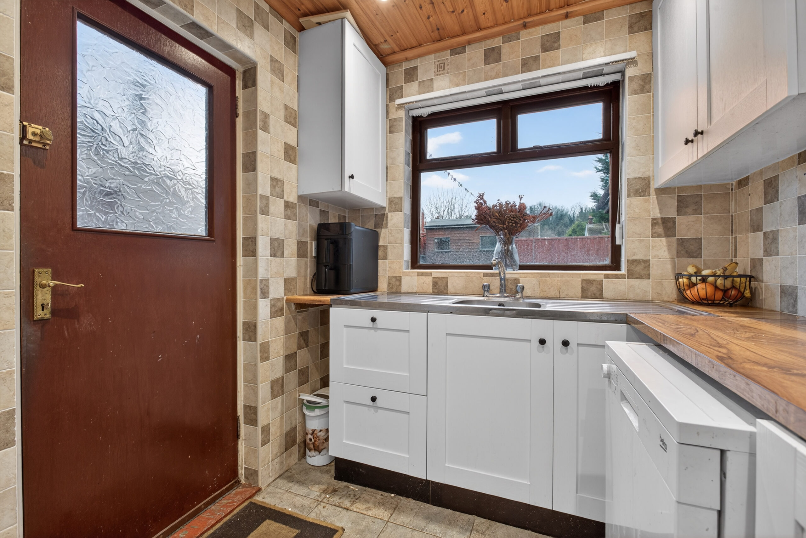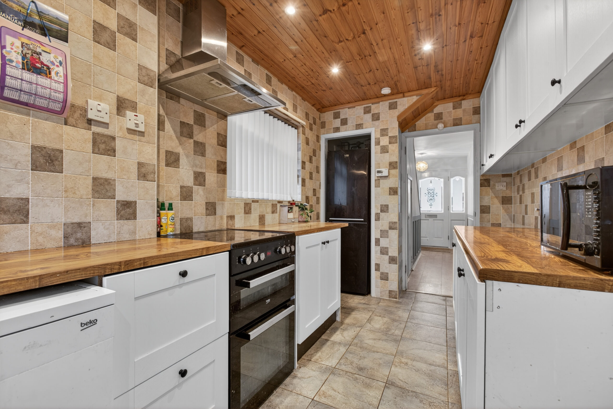 Galley style kitchen with range of shaker style doors and wood block effect worktops and space for electric cooker, stainless steel canopy and extractor, space for dishwasher, recess for storage, stainless steel sink, double drainer and mixer tap, pine panelled ceiling with spotlights, tiled flooring, door to exterior
