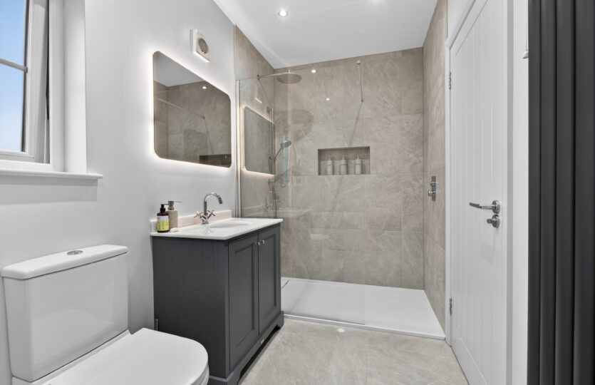 Comprising tiled step in shower cubicle with shower unit off mains, drench head and separate hand shower set, vanity unit with granite top and oval counter top basin with counter top mixer tap, wall mounted mirror with lighting, back to wall low flush wc, heated towel rail, tiled flooring, recessed spotlights