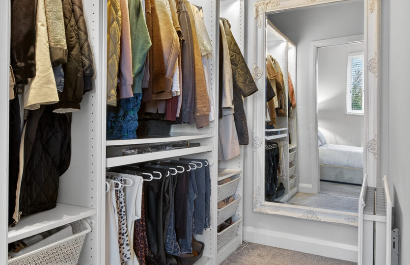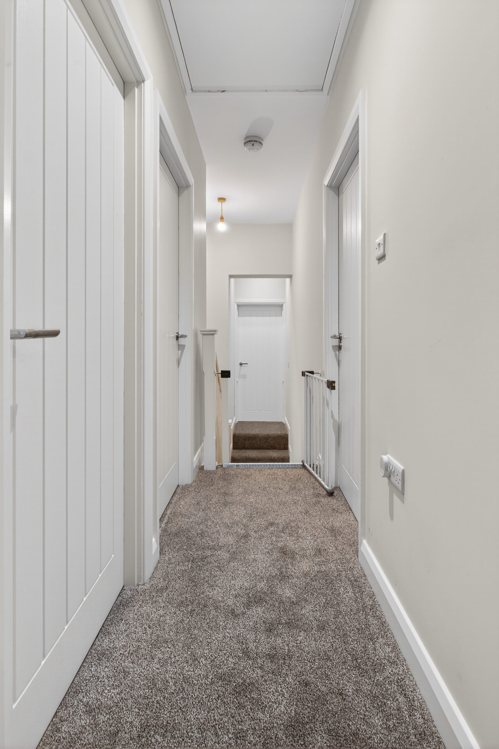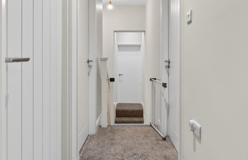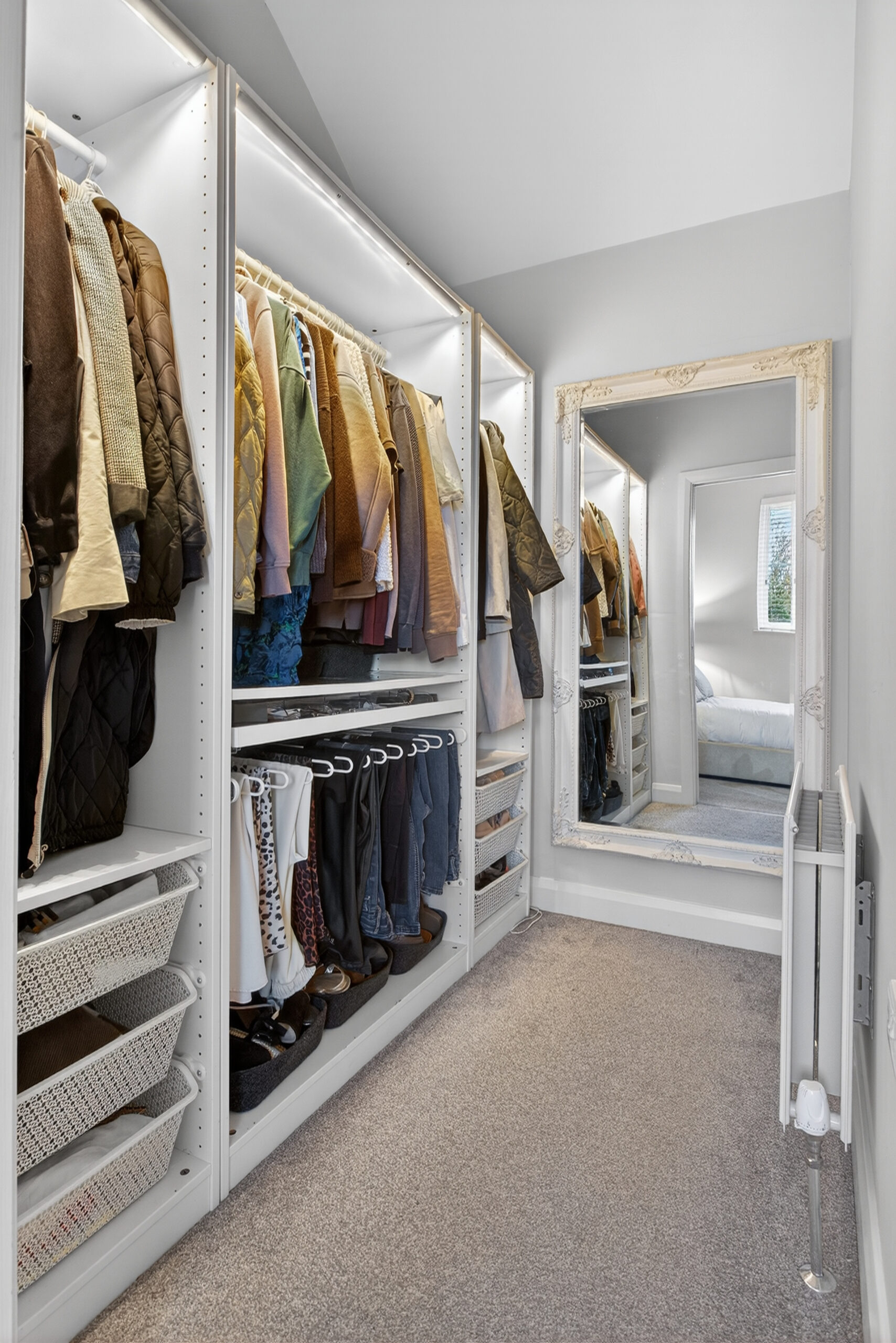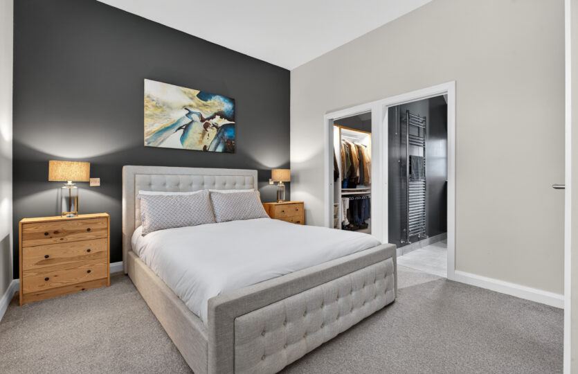 A split-level landing leads to the master bedroom suite on one side which benefits from a walk in dressing area and ensuite shower room. The spacious bathroom comprises of a step-in shower and freestanding bath with a floor mounted mixer tap.