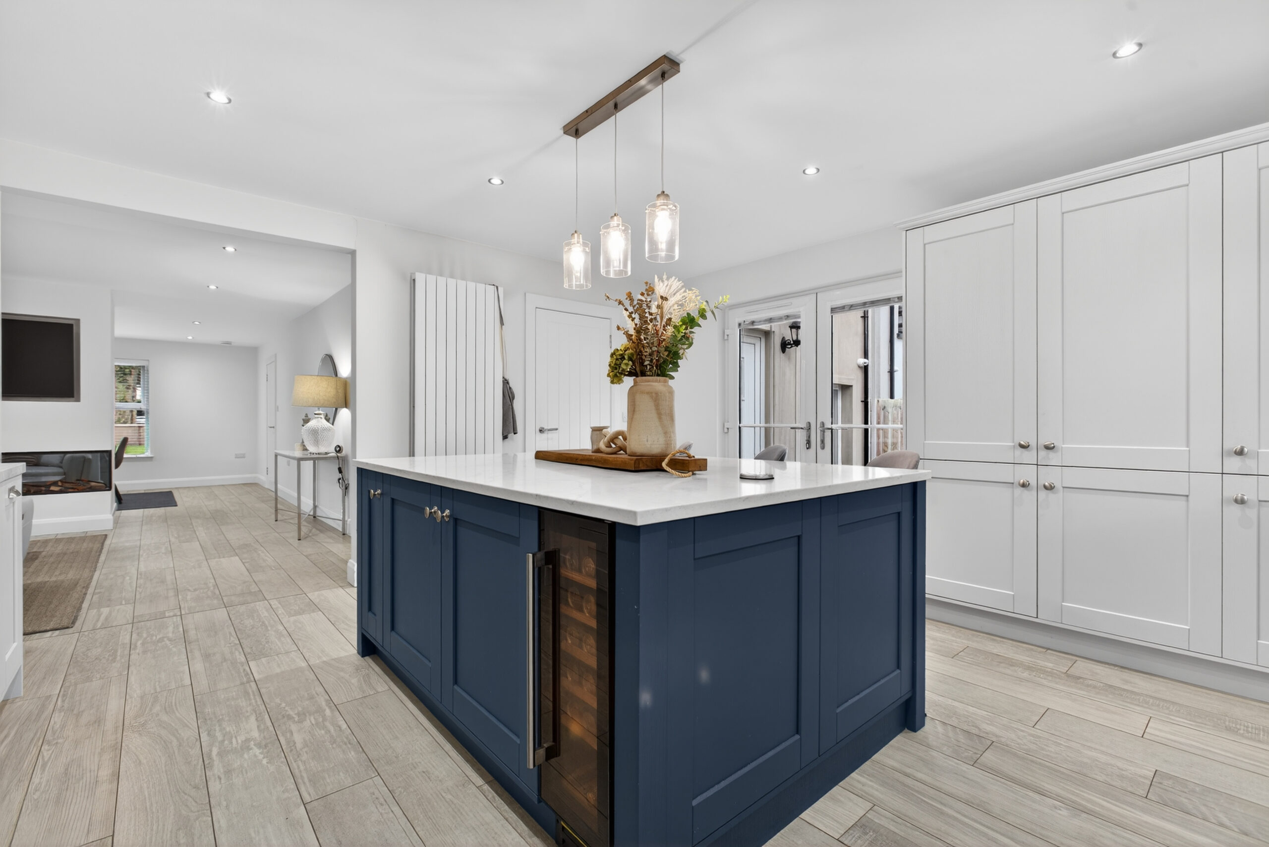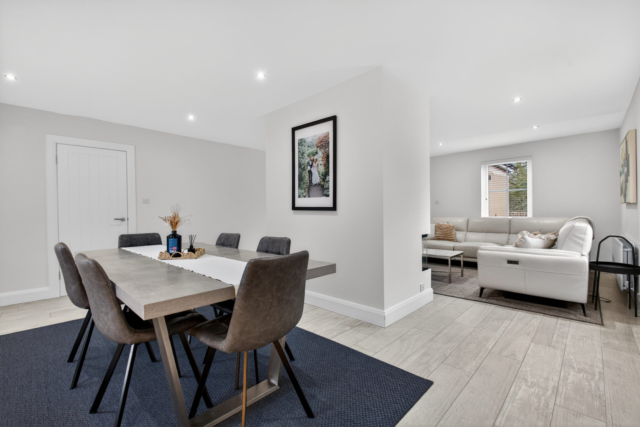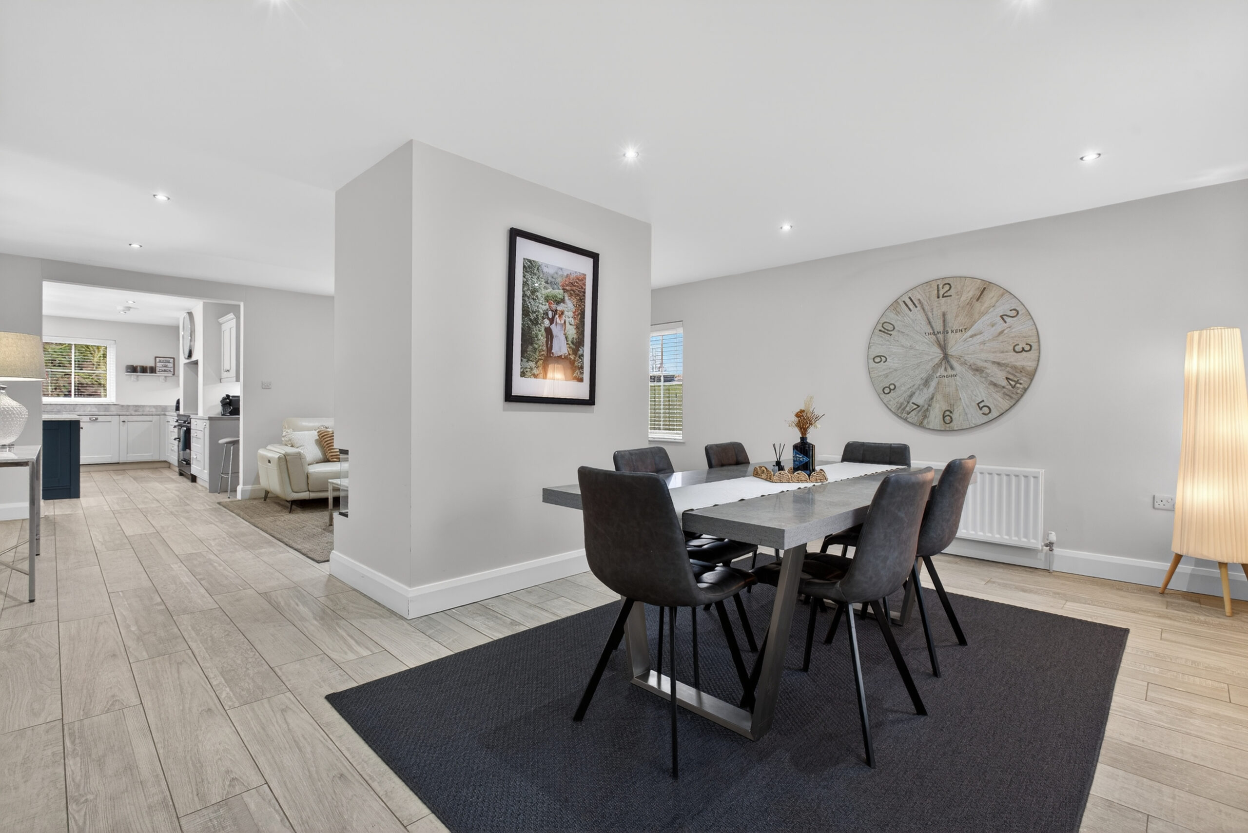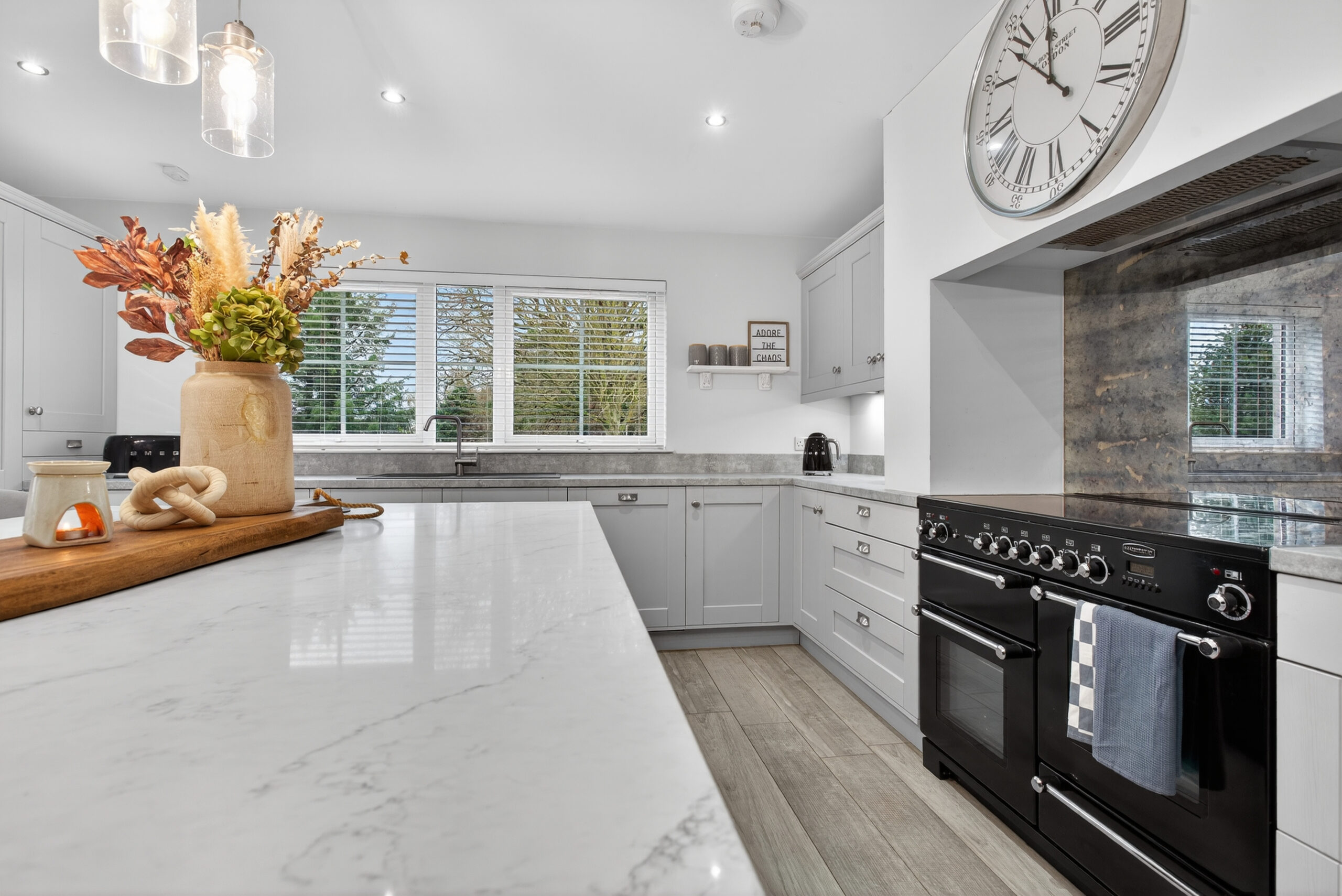 The ground floor features an entrance hall with a cloak’s cupboard, separate WC and understairs storage and leads to the spacious open plan living dining space which includes a centred media wall with wraparound log burning effect electric fire and tiled flooring extending through. The kitchen which leads off this area, is completed with shaker style cabinetry, a range of integrated appliances, a Rangemaster cooker and an Island unit with granite worksurface and seating recess. A utility/laundry room is also accessed off this area.