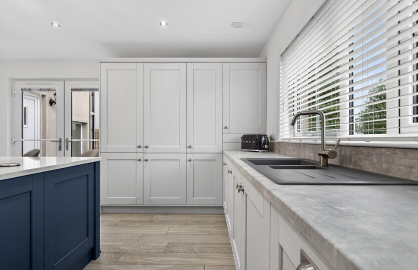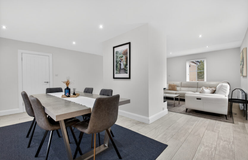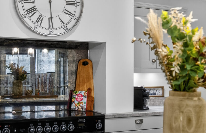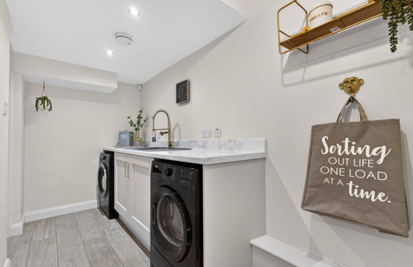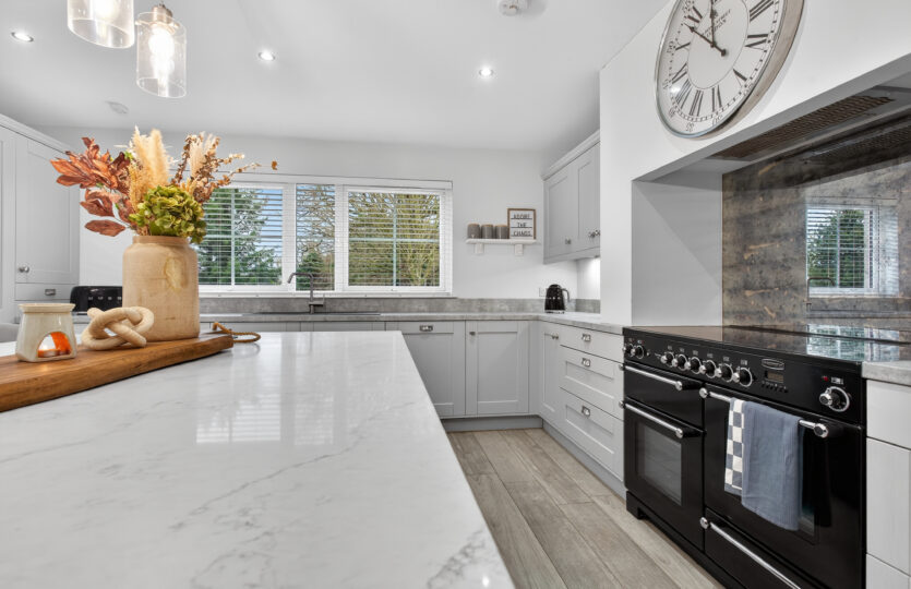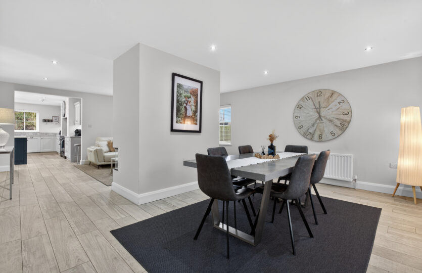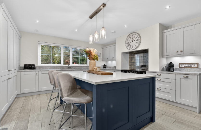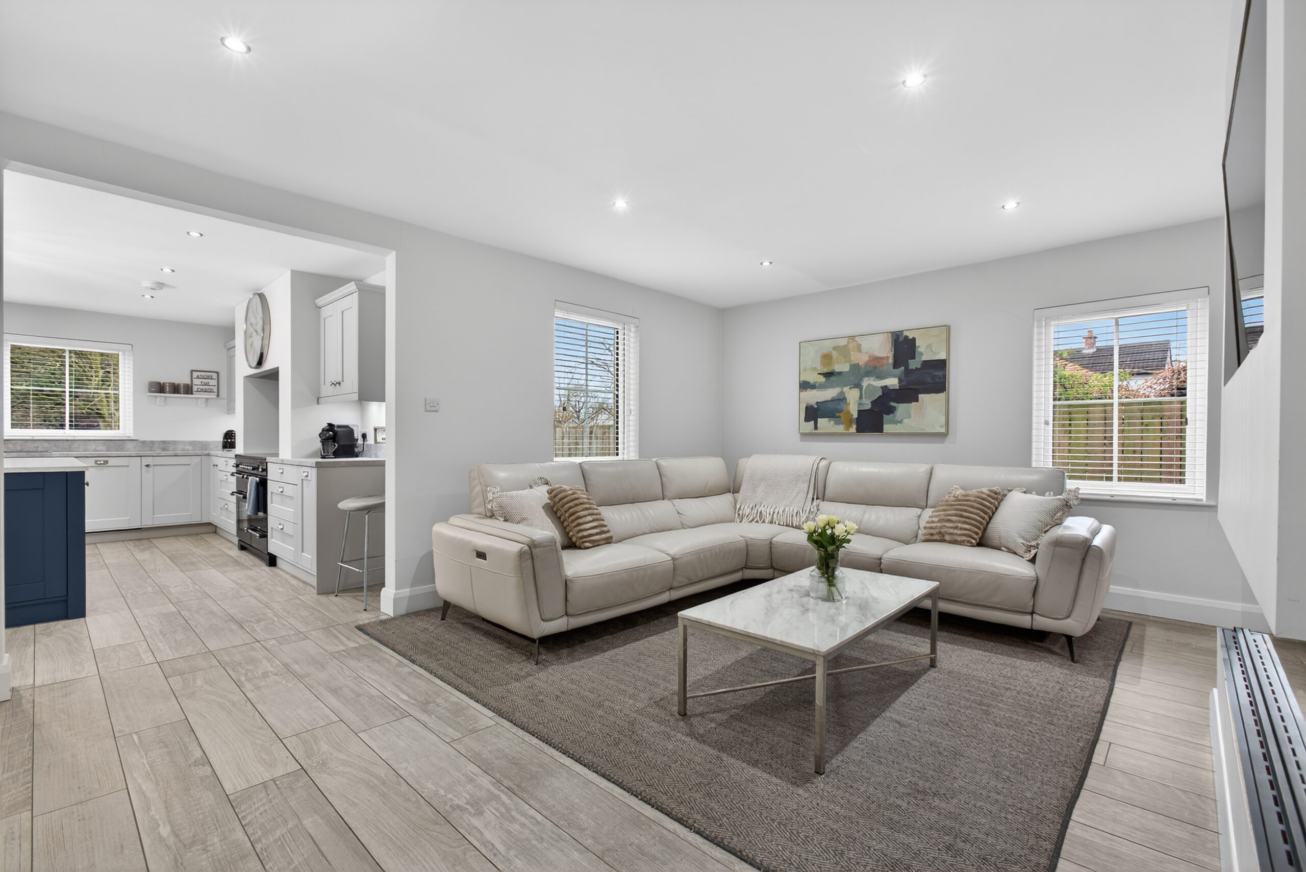 The ground floor features an entrance hall with a cloak’s cupboard, separate WC and understairs storage and leads to the spacious open plan living dining space which includes a centred media wall with wraparound log burning effect electric fire and tiled flooring extending through. The kitchen which leads off this area, is completed with shaker style cabinetry, a range of integrated appliances, a Rangemaster cooker and an Island unit with granite worksurface and seating recess. A utility/laundry room is also accessed off this area.