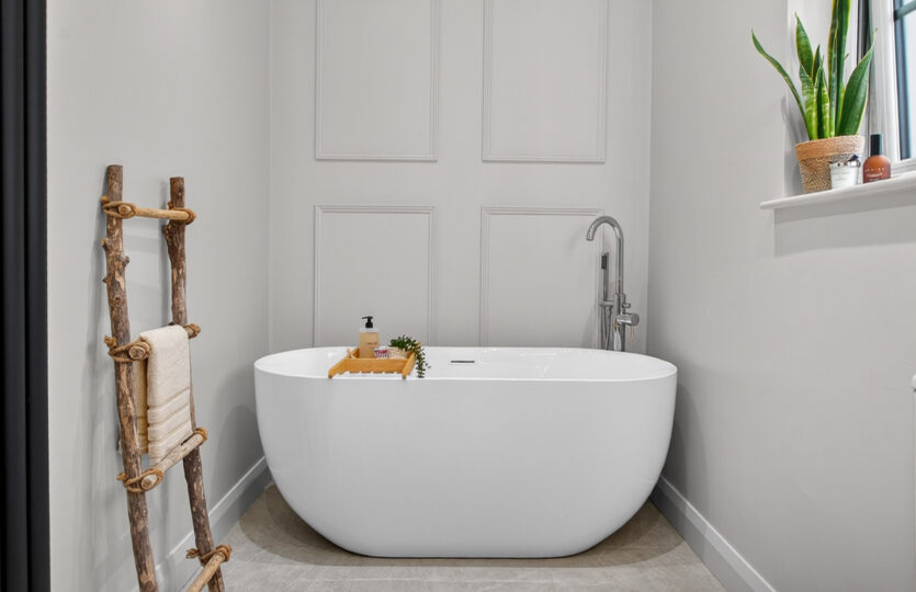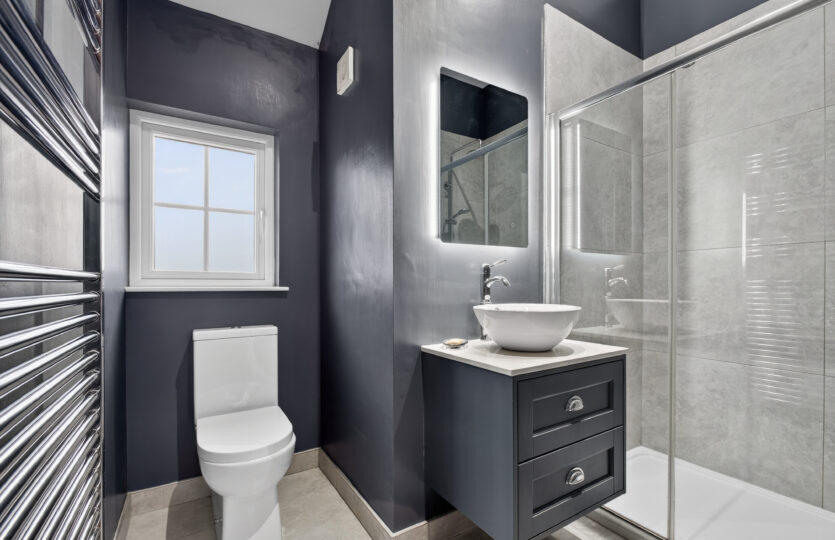 Comprising step in fully tiled shower cubicle with shower unit off mains, drench head and separate hand shower set, vanity unit with quartz work top and inset basin and mixer tap, wall mounted mirror with lighting, back to wall low flush wc, freestanding bath, floored mounted mixer tap and separate hand shower set, feature panelling, vertical slatted radiator, tiled flooring, recessed spotlights