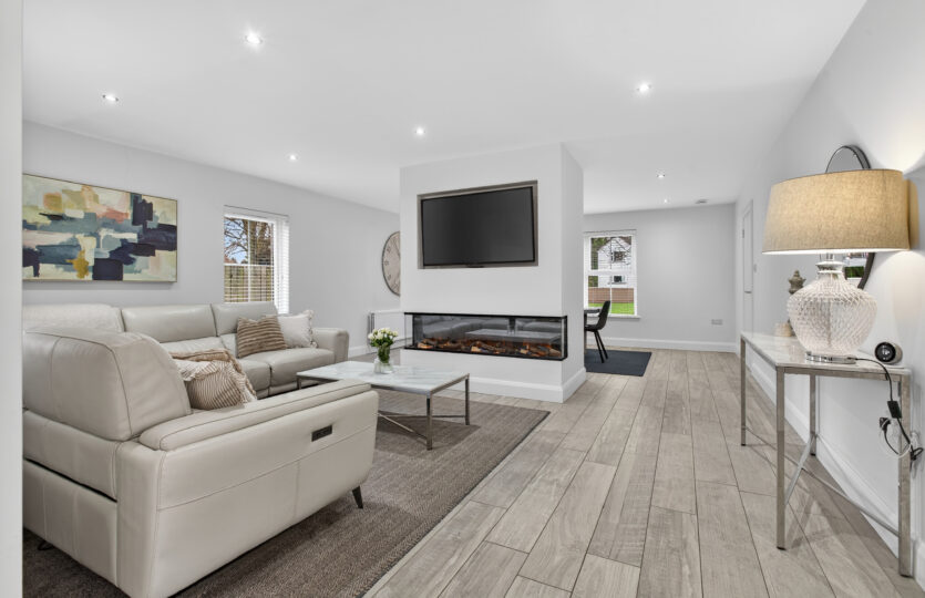 Centred media wall with Evonic e1800 wrap around log burning effect electric fire, recess for 55” TV, data point, recessed spotlights, low level TV point, open to;