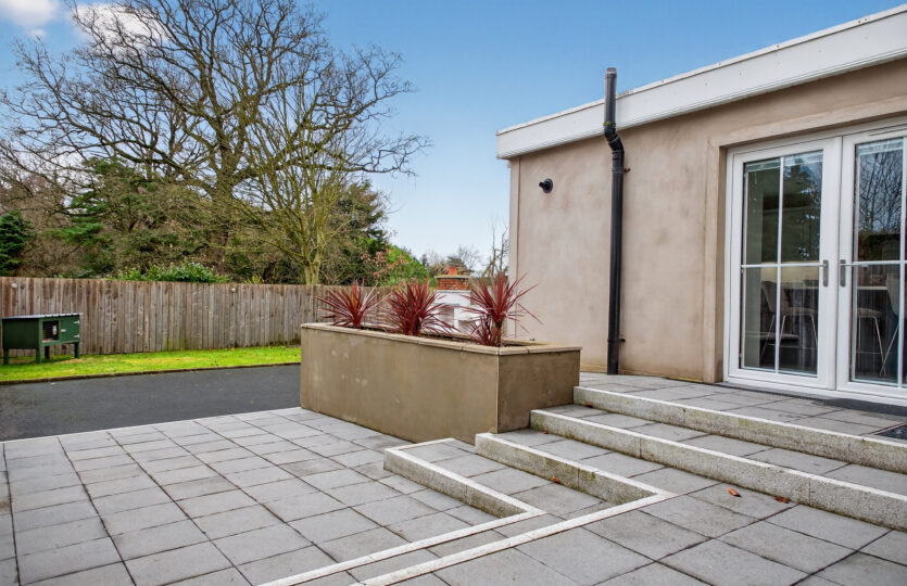 Enclosed rear garden with lawned area, paved steps leading to paved patio area