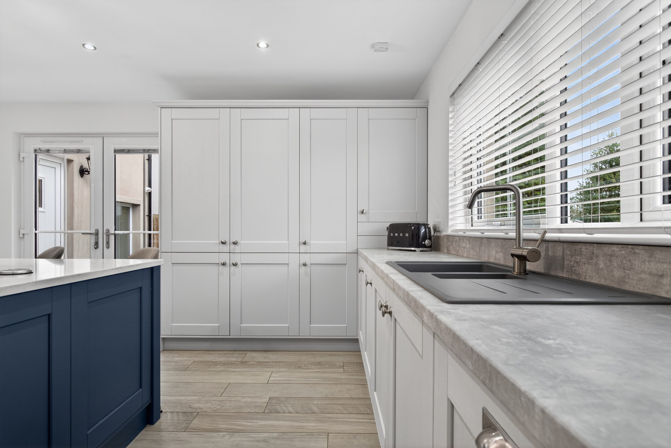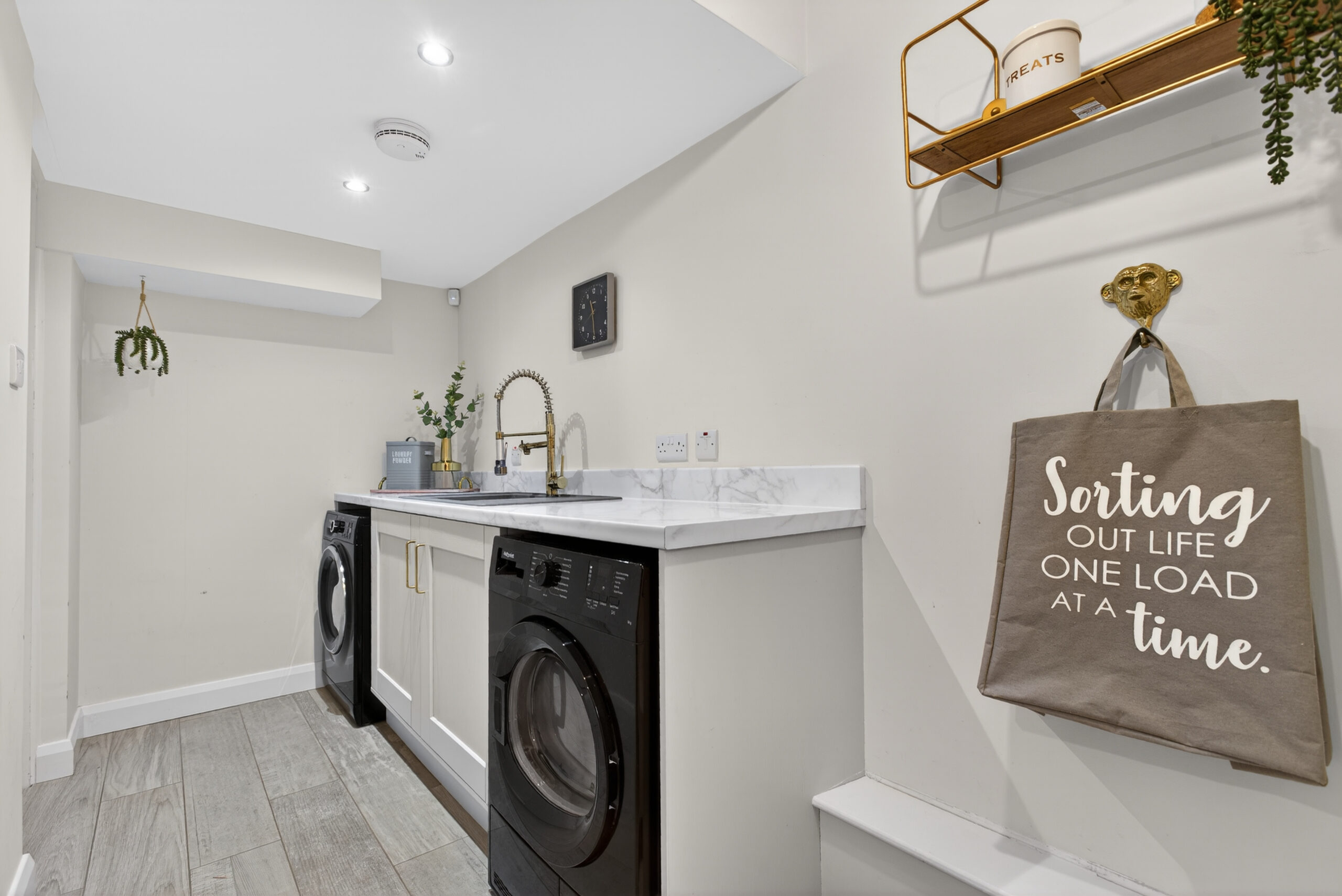 Including low level range of shaker style cabinetry with granite effect worktop and upstands and space for washing machine and tumble dryer, composite sink unit with mixer tap and separate rinse head, double built in shelved cabinet, door to exterior