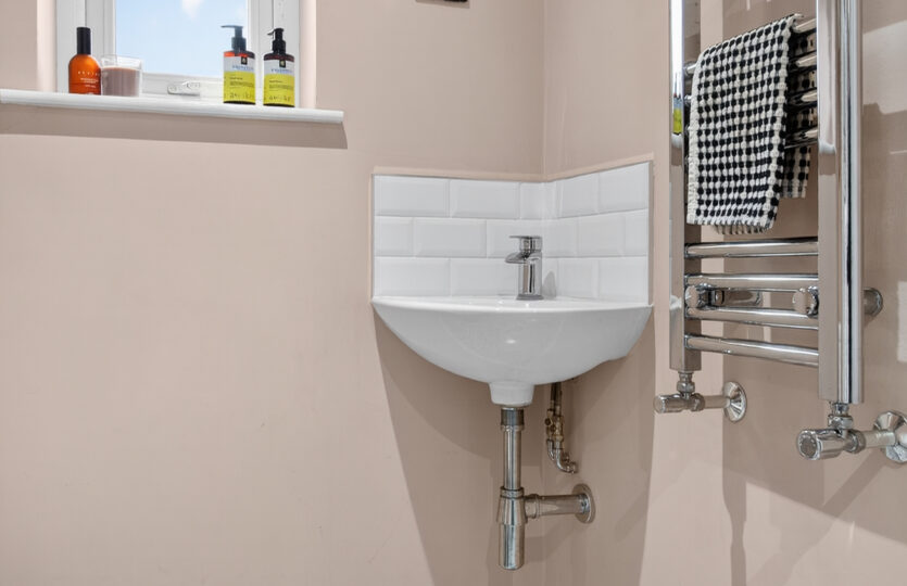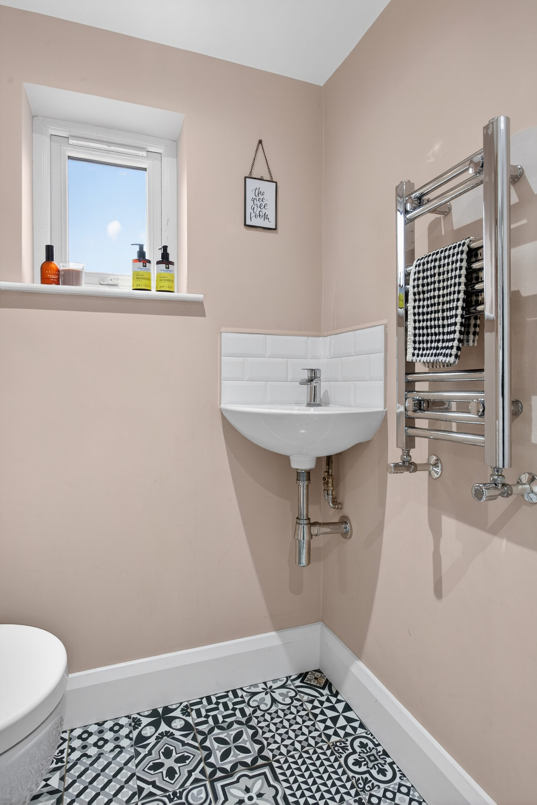 Comprising corner aspect wall mounted basin with mixer tap and brick effect tiled splashback, back to wall low flush wc, wall mounted heated towel rail, mosaic effect tiled flooring, recessed spotlights