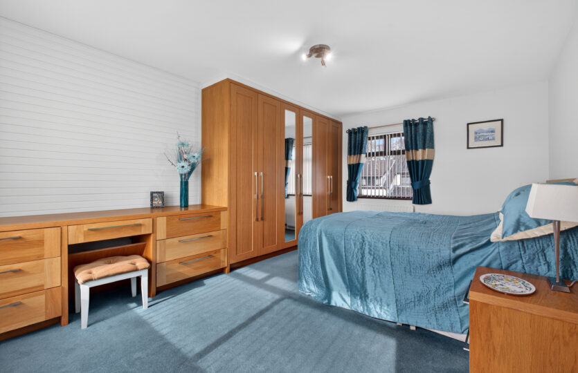 Featuring full wall length range of fitted bedroom furniture finished in oak including dressing table and wardrobes, fitted head board and beside tables to either side finished in oak