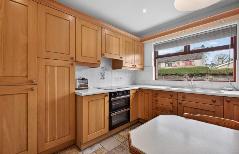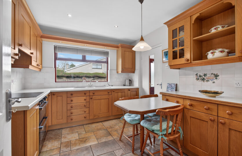 Featuring fitted kitchen finished in oak with Smeg 4 ring Schott Ceran glass plate electric hob, pull out canopy and extractor, Belling low level fan assisted oven and separate grill, integrated low level fridge, 1 1/2 bowl sink unit and mixer tap with pelmet above and integrated spotlights, TV point, eye level display cabinet, breakfast bar, partly tiled surround, integrated spotlights, tiled flooring