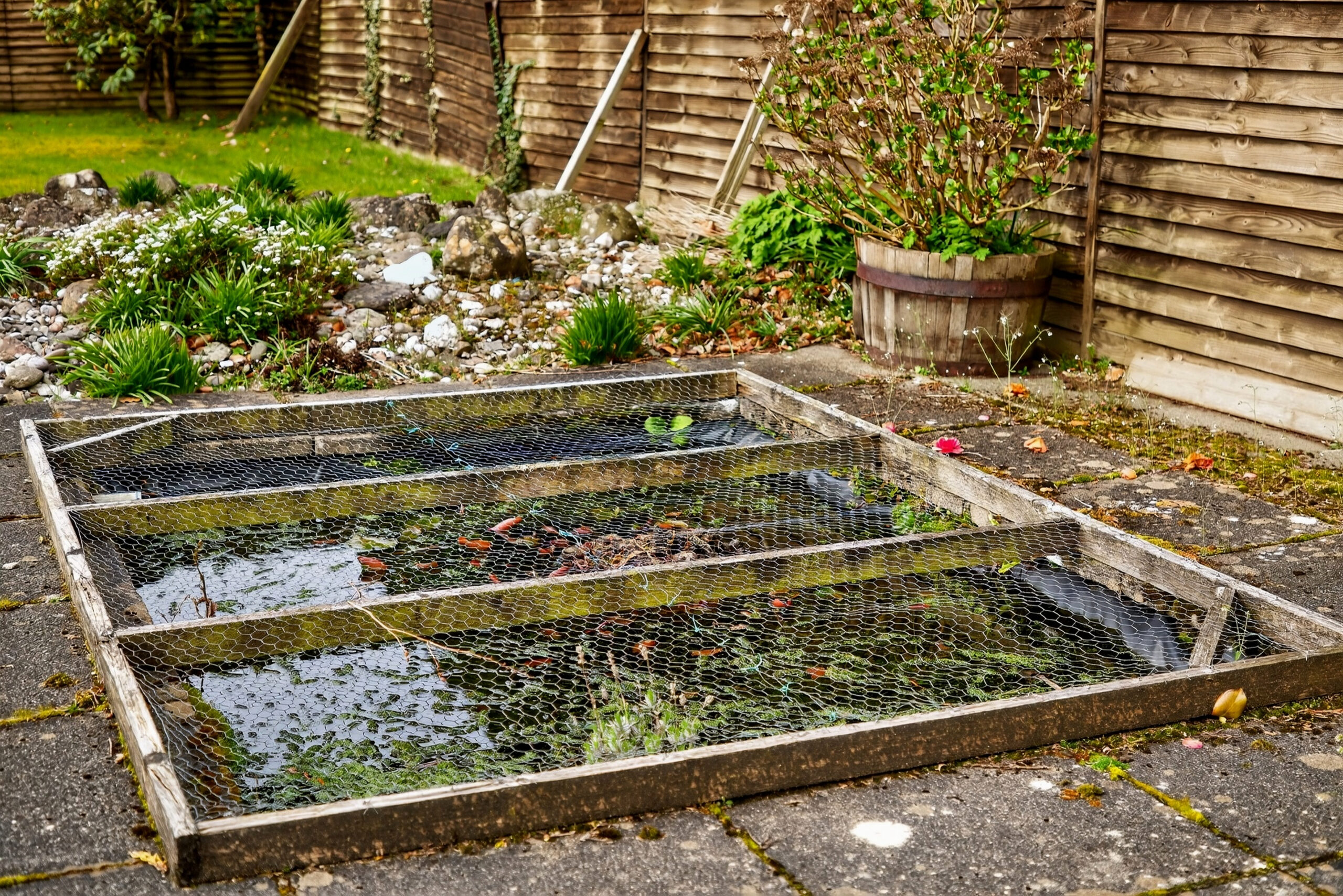 Tarmac driveway providing off street parking and leading to garage, lawned areas either side with flower and shrub beds, access leading to enclosed rear garden (north westerly facing) with lawned area, paved access paths, flower and shrub beds, outside tap, outside lighting