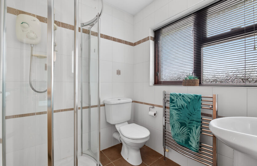 With fully tiled walls and comprising corner aspect shower cubicle with Mira Event shower unit, pedestal wash hand basin, wall mounted cabinet above, low flush wc, tiled flooring