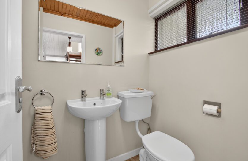 Comprising pedestal wash hand basin, low flush wc, pine panelled ceiling, tiled flooring