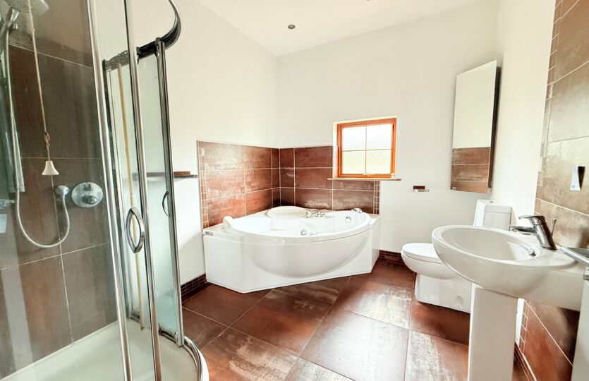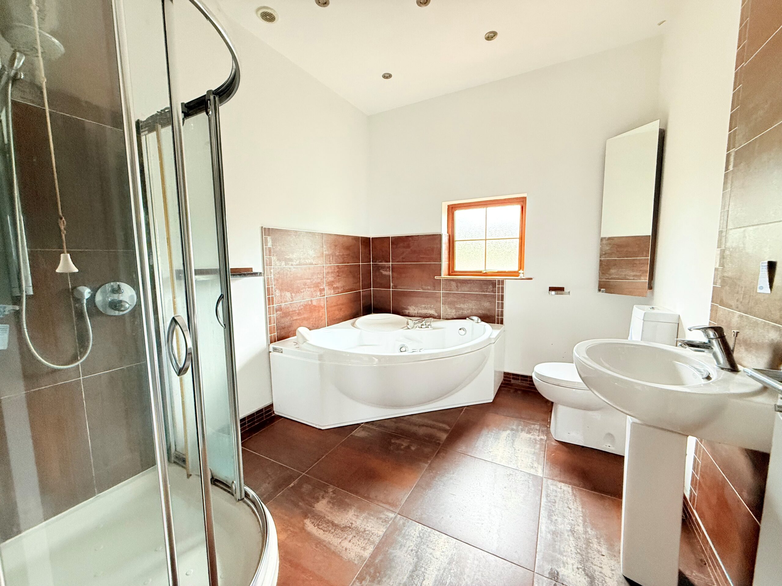 Corner bath, quadrant shower cubicle, low flush wc, pedestal wash hand basin, part tiled walls, tiled flooring, uPVC double glazed window to front