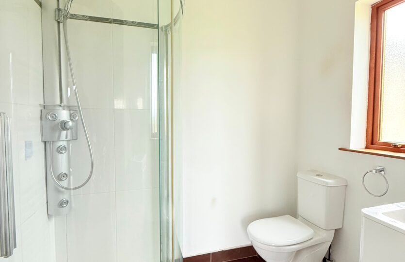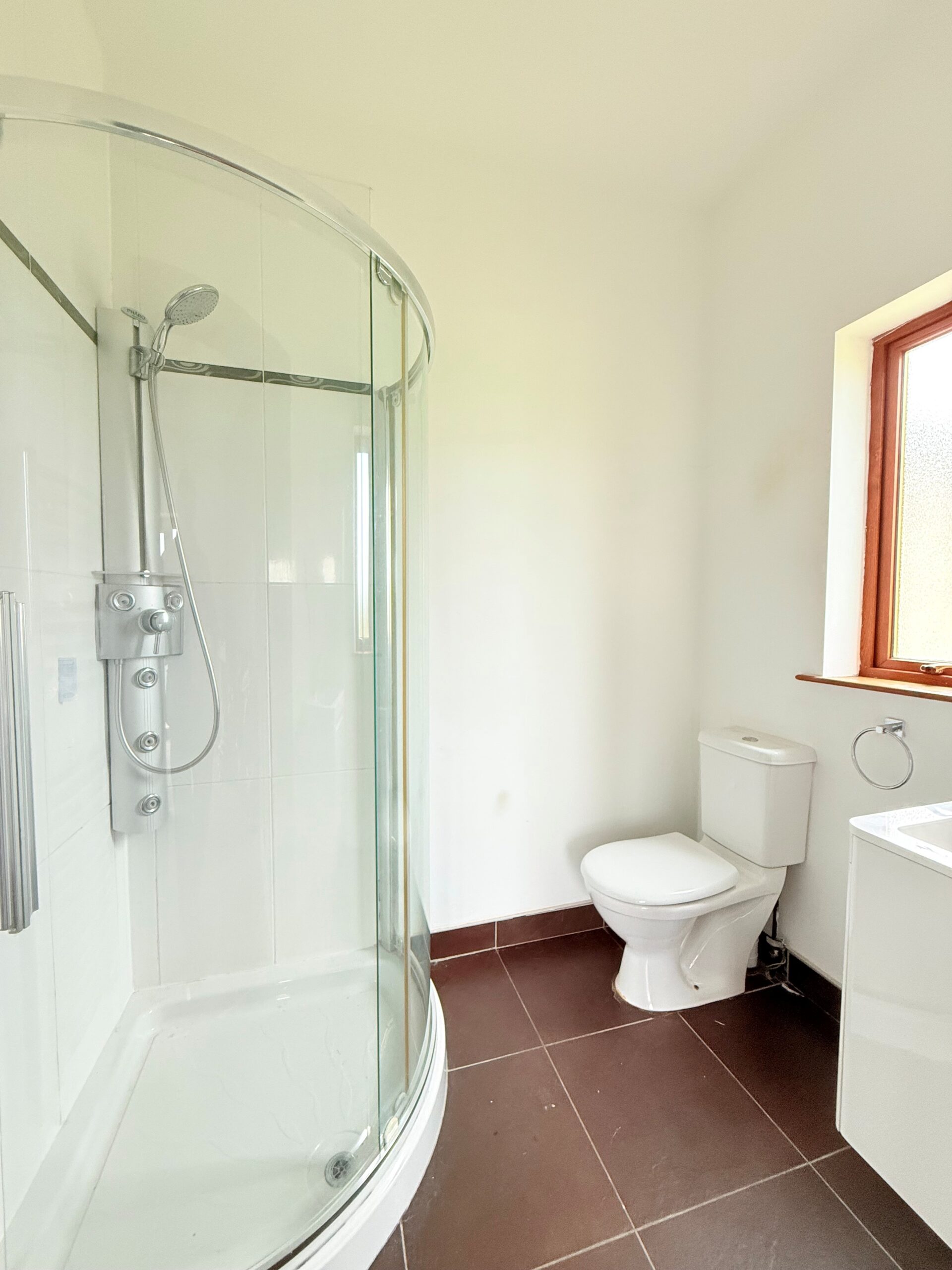 Quadrant shower cubicle, low flush wc, wall mounted wash hand basin set on vanity unit, uPVC double glazed window to side, tiled flooring, part tiled walls