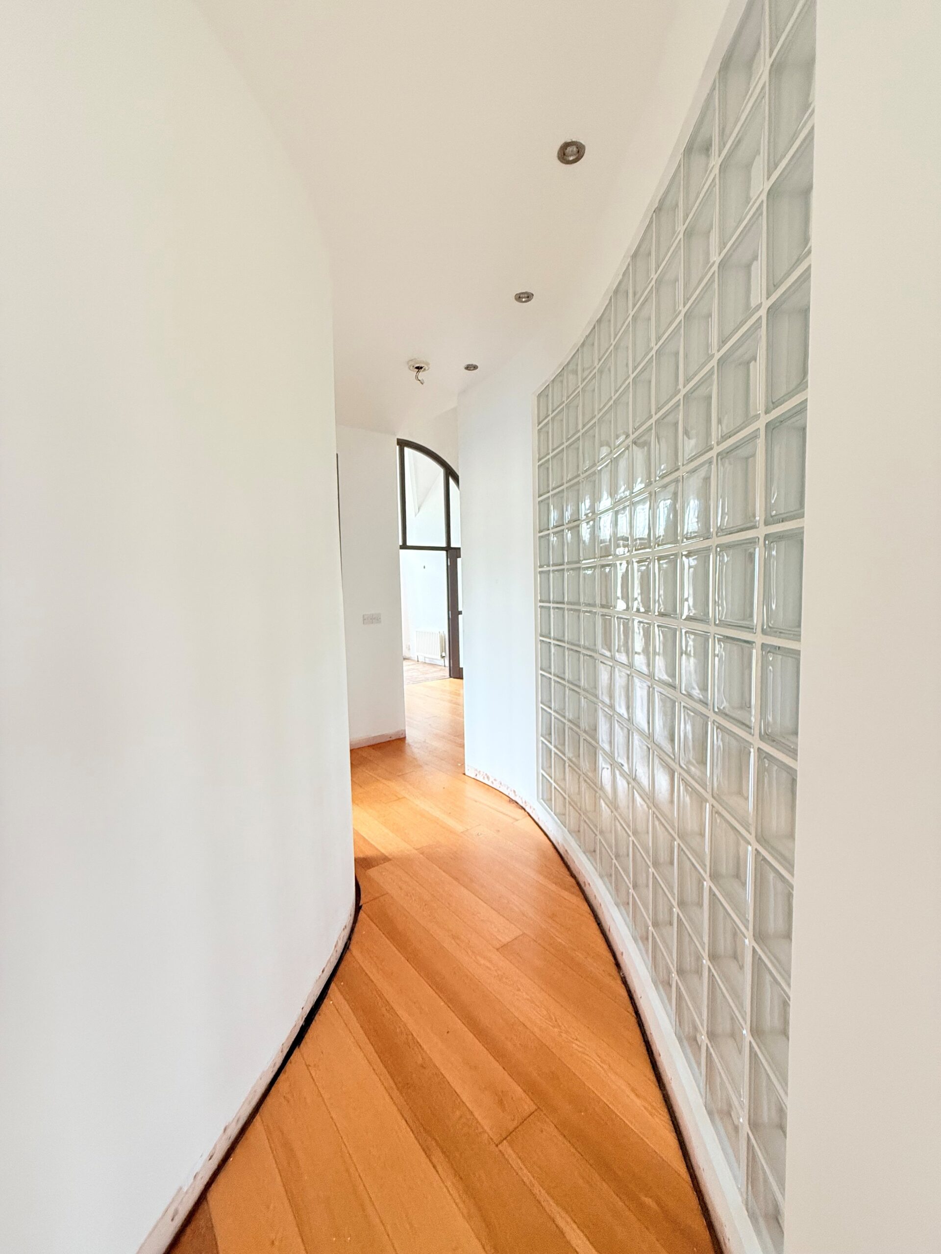 Vaulted ceiling with wooden beams, opening for fireplace, radiator, uPVC double glazed windows to front, side and rear