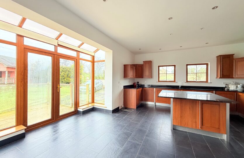 Eye and low level units with granite worktops and upstands, central island, double sink with mixer tap, space for American fridge freezer, uPVC double glazed window to front, uPVC double glazed French doors and windows to side, tiled flooring, radiator, door to utility room