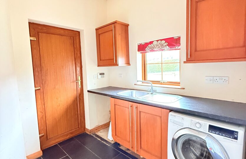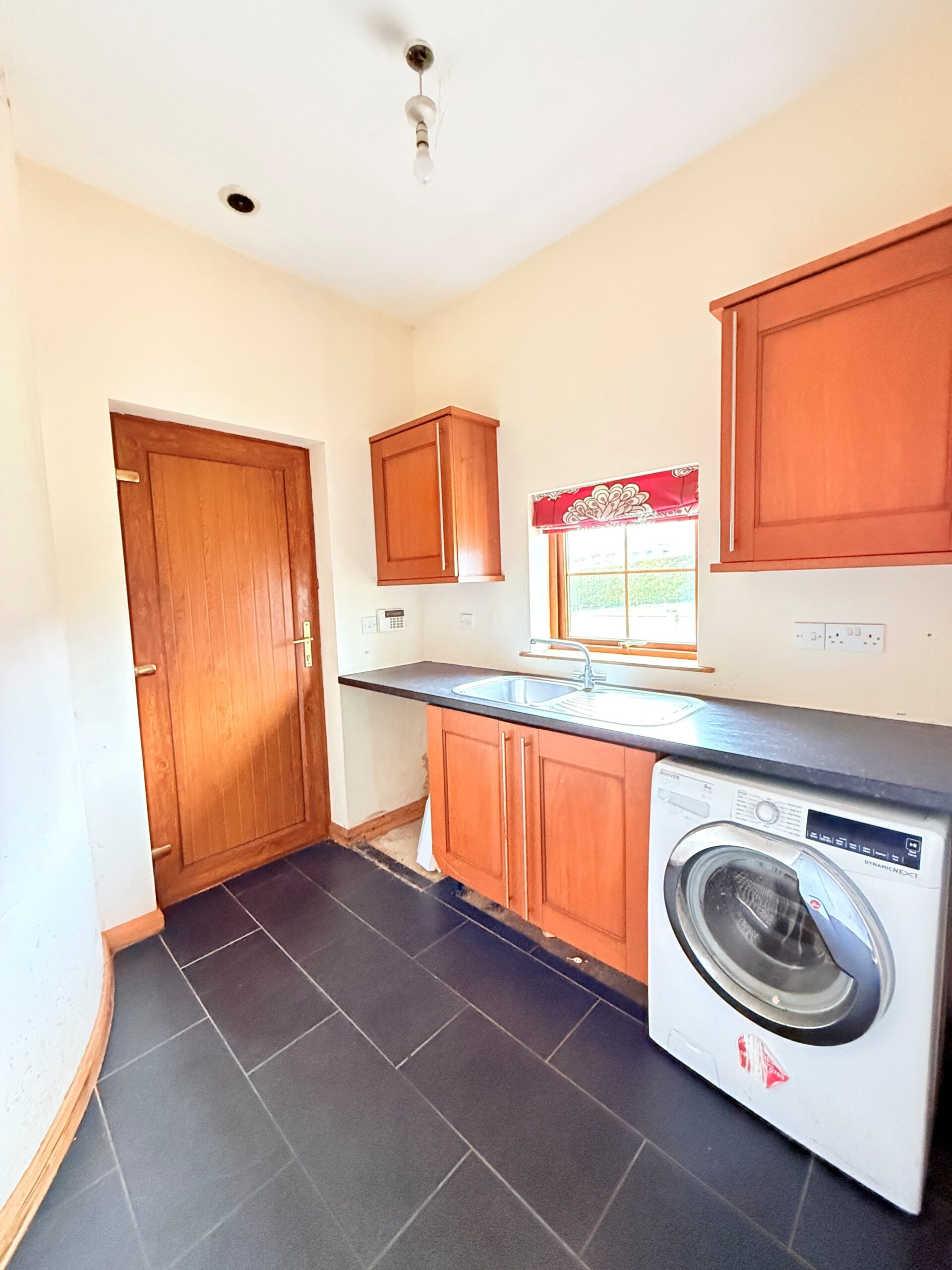 Eye and low level units, plumbed for washing machine, space for tumble dryer, stainless steel sink with mixer tap, uPVC double glazed window to side, uPVC door to rear, tiled flooring