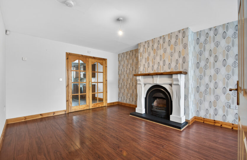uPVC double glazed windows to front, radiator, laminated wooden flooring, cast iron fireplace with tiled hearth, painted surround, glazed French doors into kitchen/diner