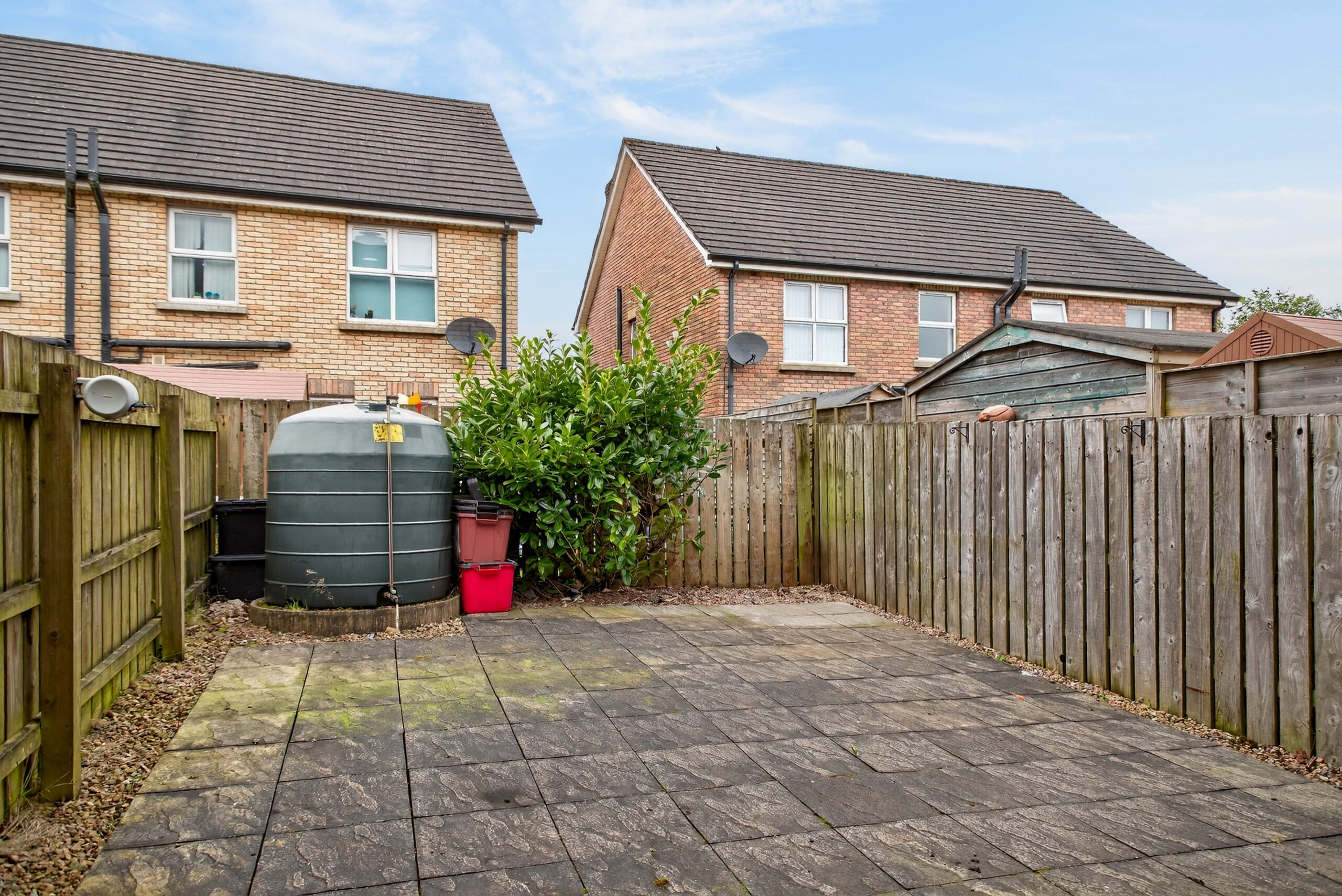 Enclosed paved rear garden with gated pedestrian access, outside lighting and tap