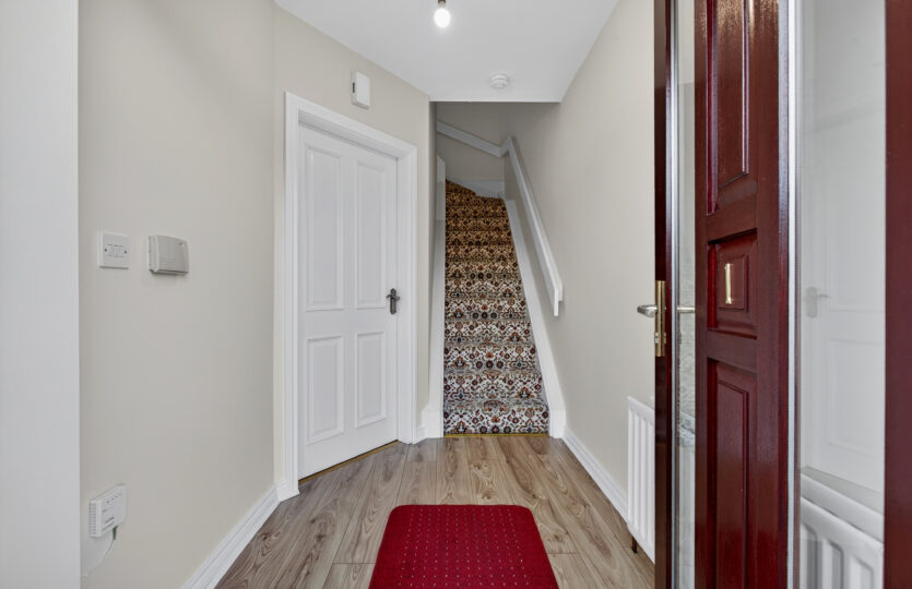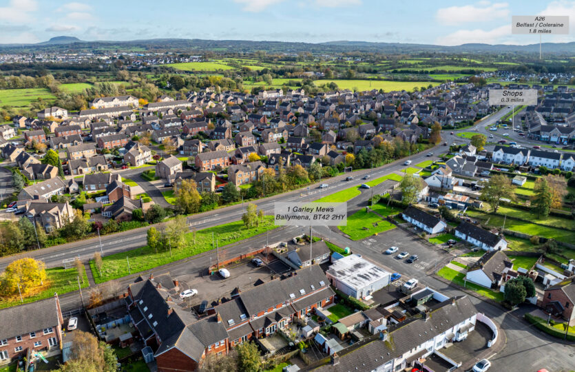 This spacious 3-bedroom end town house is positioned within this popular, small development located within Tullygarley and on the periphery of Galgorm. Extending to approximately 1,270 sq ft, the accommodation within features an entrance hall, excellent lounge with open fireplace and a generous kitchen/dining space with an understairs storage cupboard and wc/cloaks accessed off it. Double doors open onto an enclosed rear garden.