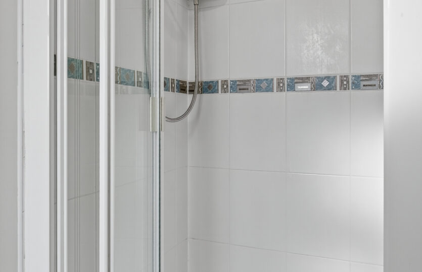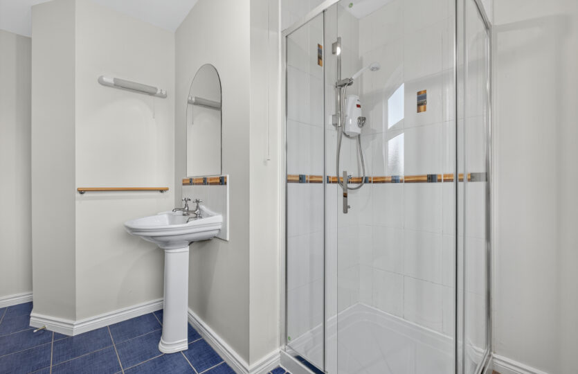 Comprising fully tiled shower cubicle with bi fold door, Redring electric shower unit, pedestal wash hand basin with splashback tiling and fitted mirror above, tiled flooring