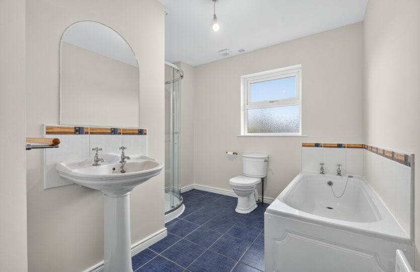 Comprising panelled bath with splashback tiling, corner aspect shower cubicle with Aqualisa electric shower unit, pedestal wash hand basin with splashback tiling and fitted mirror above, shaver point, tiled flooring