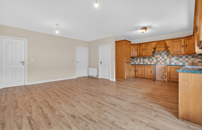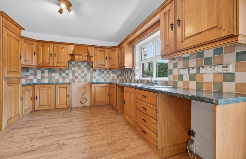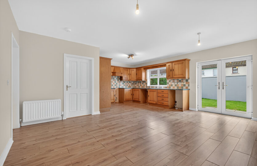 With wood effect flooring extending through and including fitted kitchen completed in oak with space for electric cooker, canopy with integrated extractor, integrated Beko fridge freezer, space for dishwasher, space for washing machine, 1/2 bowl stainless steel sink unit and mixer tap, under unit lighting, partly tiled surround, under stairs storage cupboard, TV point, double doors opening to rear garden