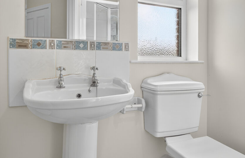 Comprising pedestal wash hand basin with tiled splashback, low flush wc