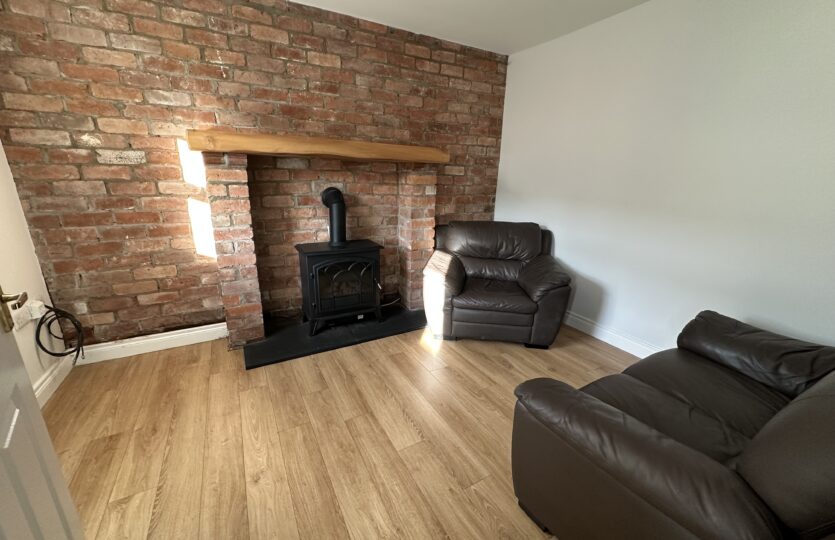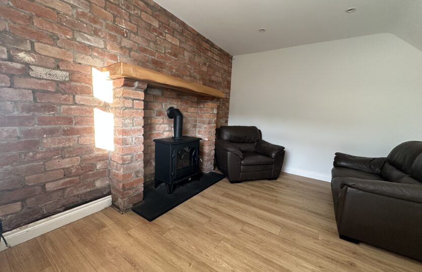 Lounge with laminated wooden floor, feature brick fireplace with log burning stove