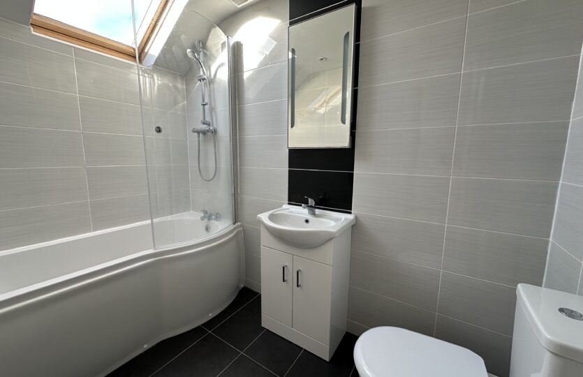 Bathroom with tiled floor, white low flush WC, white basin in vanity unit, “P” shaped shower bath with over bath thermostatic shower