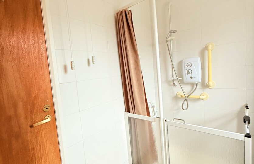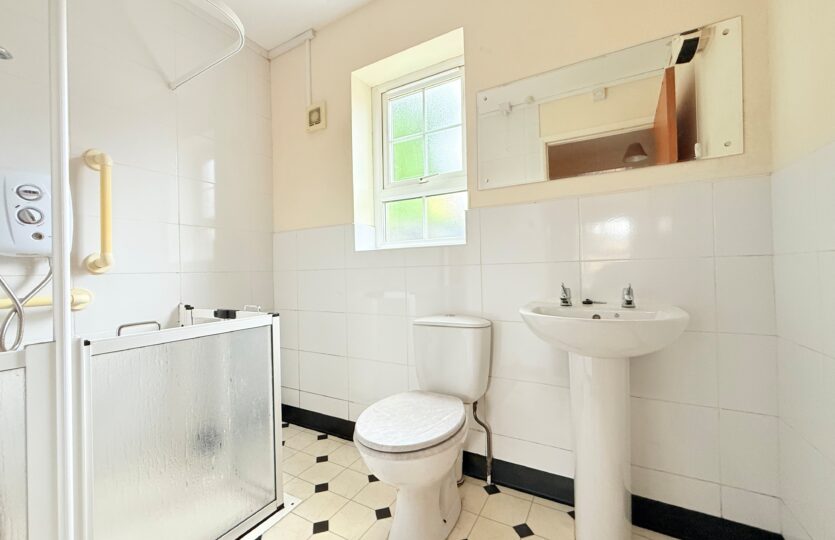 Low flush wc, pedestal wash hand basin, shower enclosure with Triton electric shower, uPVC double glazed window to rear, part tiled walls, vinyl flooring, wall mounted electric heater