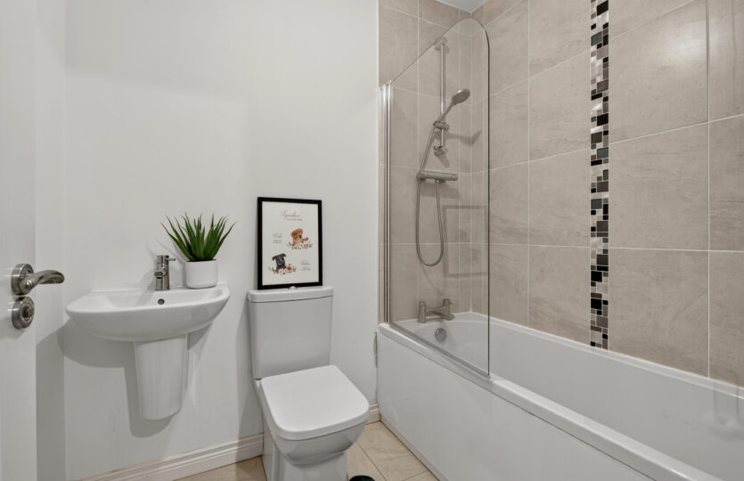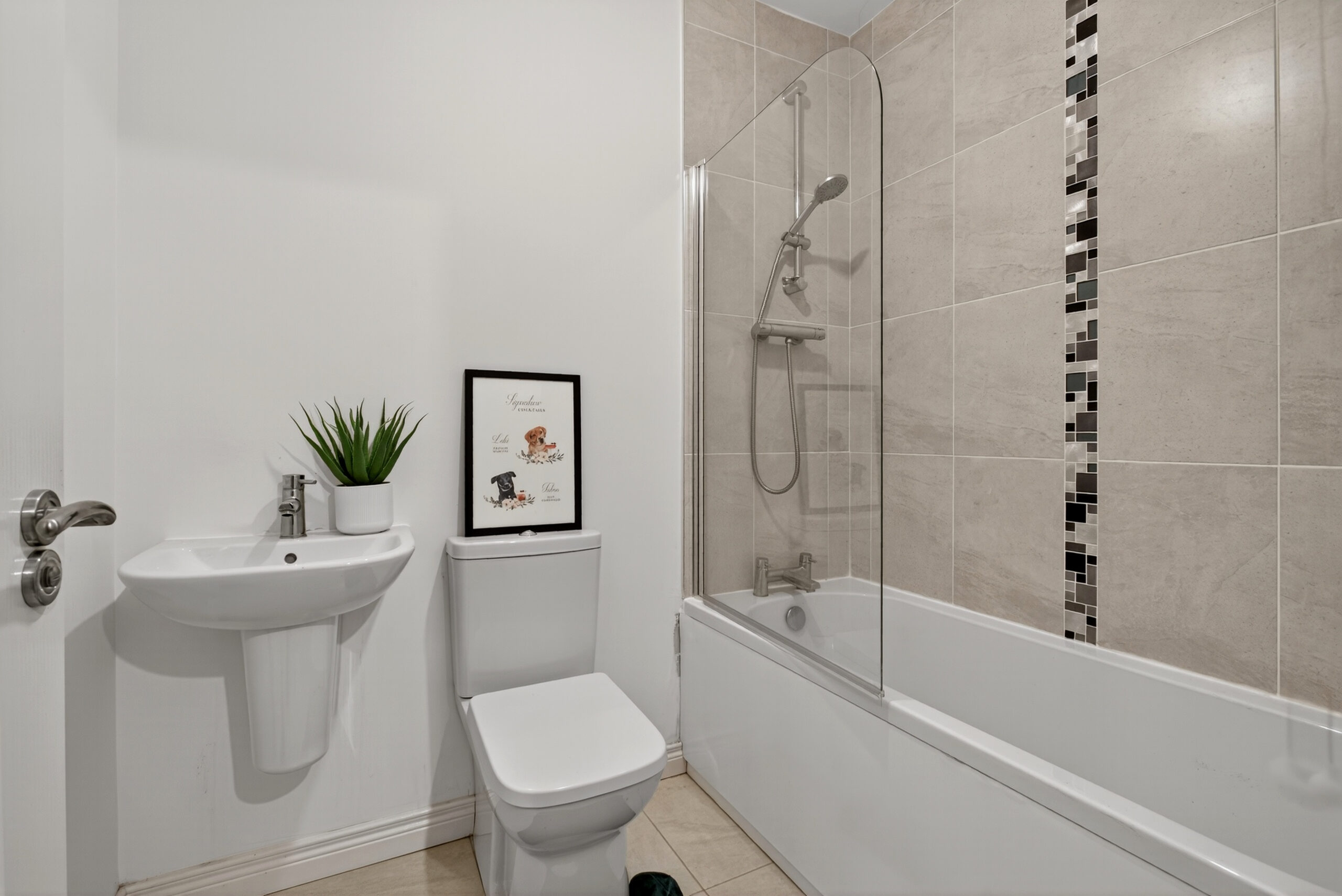 Bath with shower screen, mixer tap and thermostatic shower over, low flush wc, wall mounted wash hand basin, part tiled walls, tiled flooring, radiator