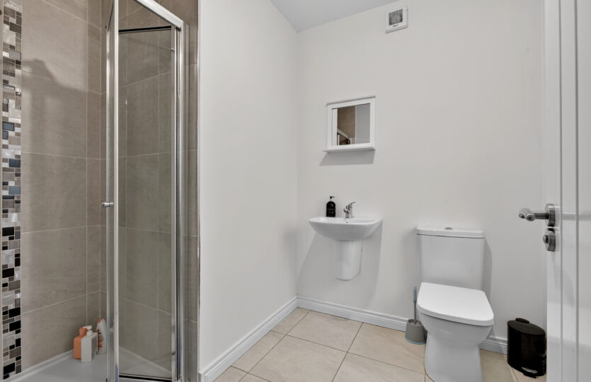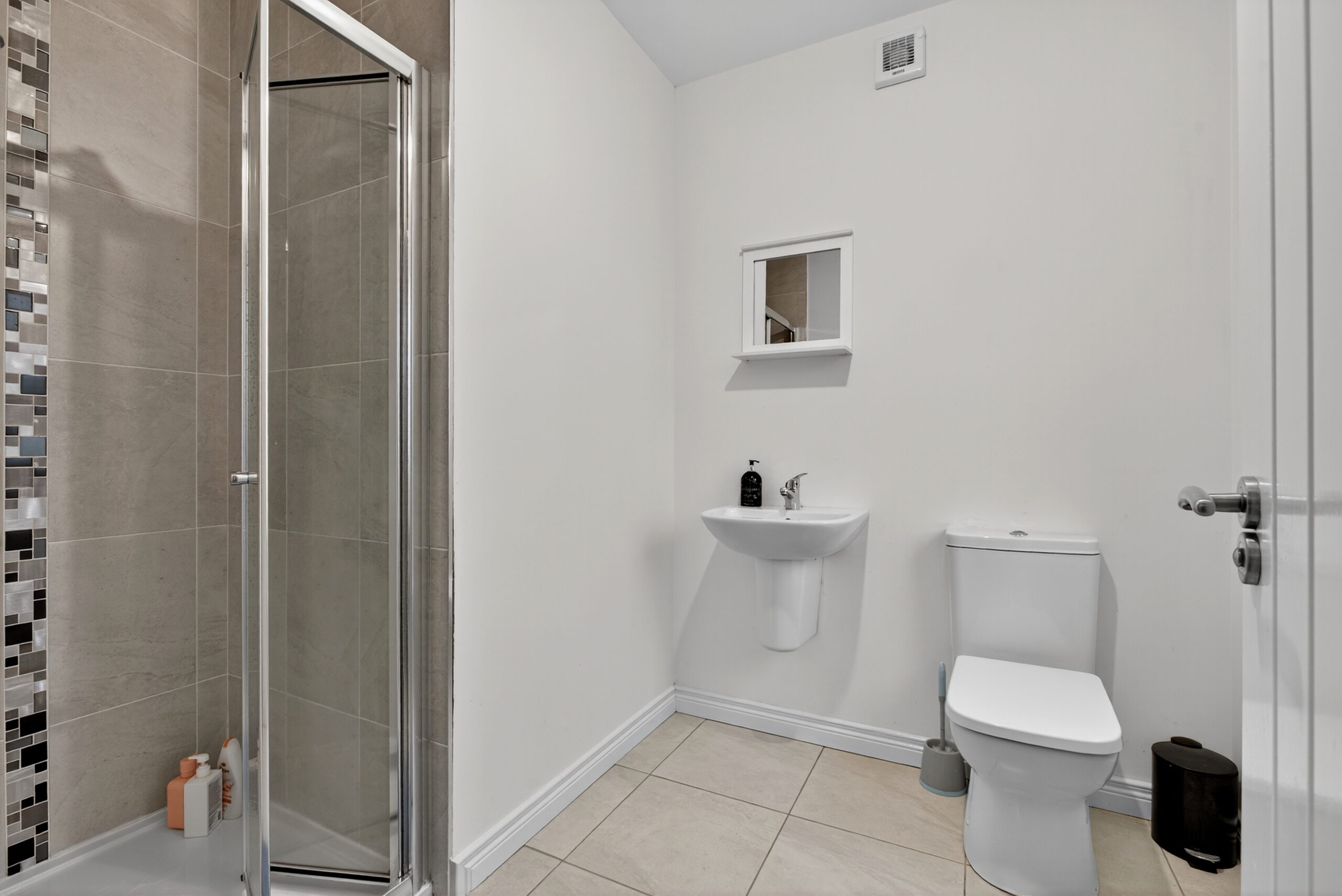 Step in tiled shower cubicle, wall mounted wash hand basin, low flush wc, tiled flooring, radiator, uPVC double glazed window to front