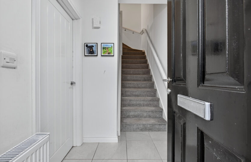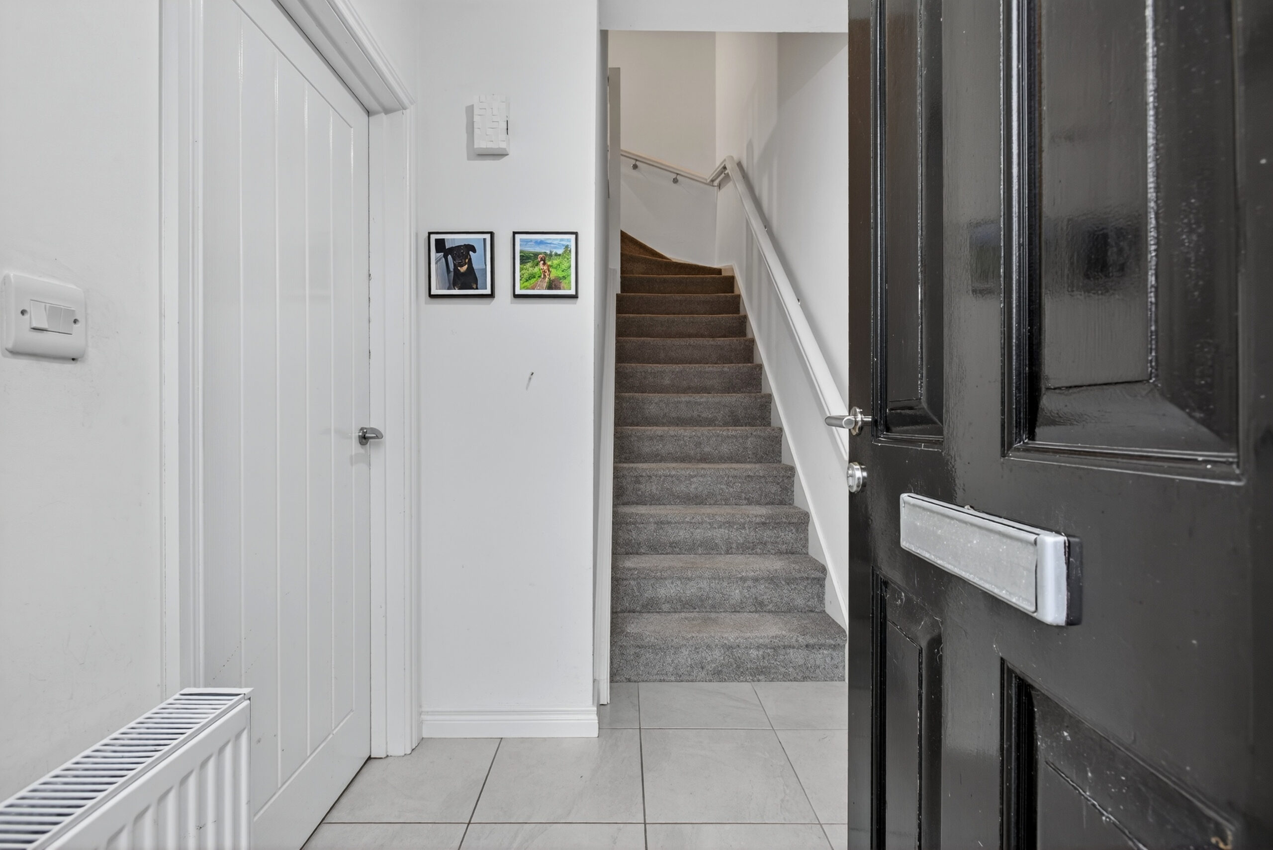 Hardwood door to front with double glazed fan light above, tiled flooring, radiator, staircase to first floor, telephone point, door into lounge
