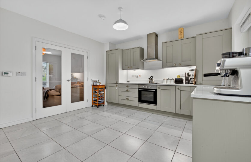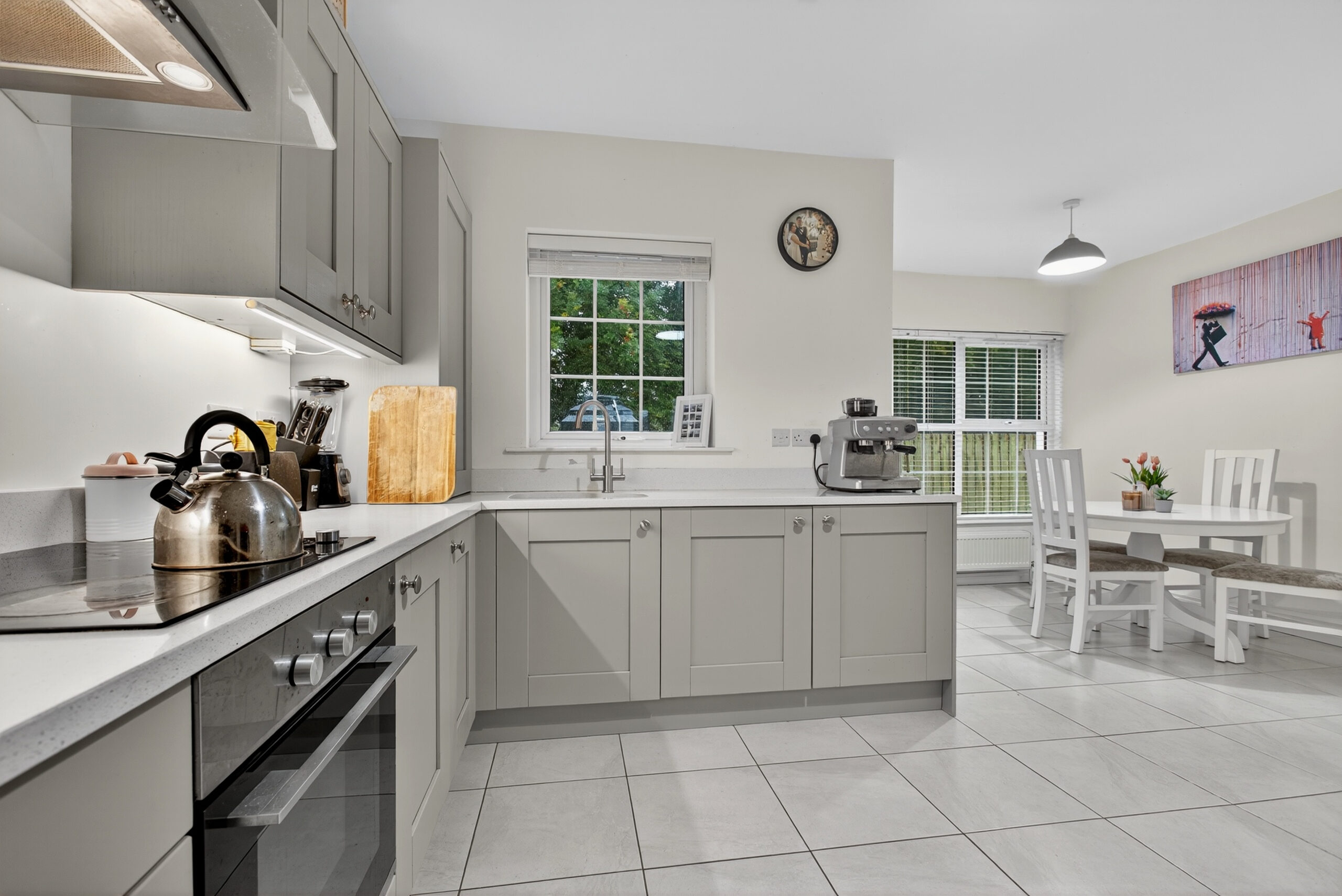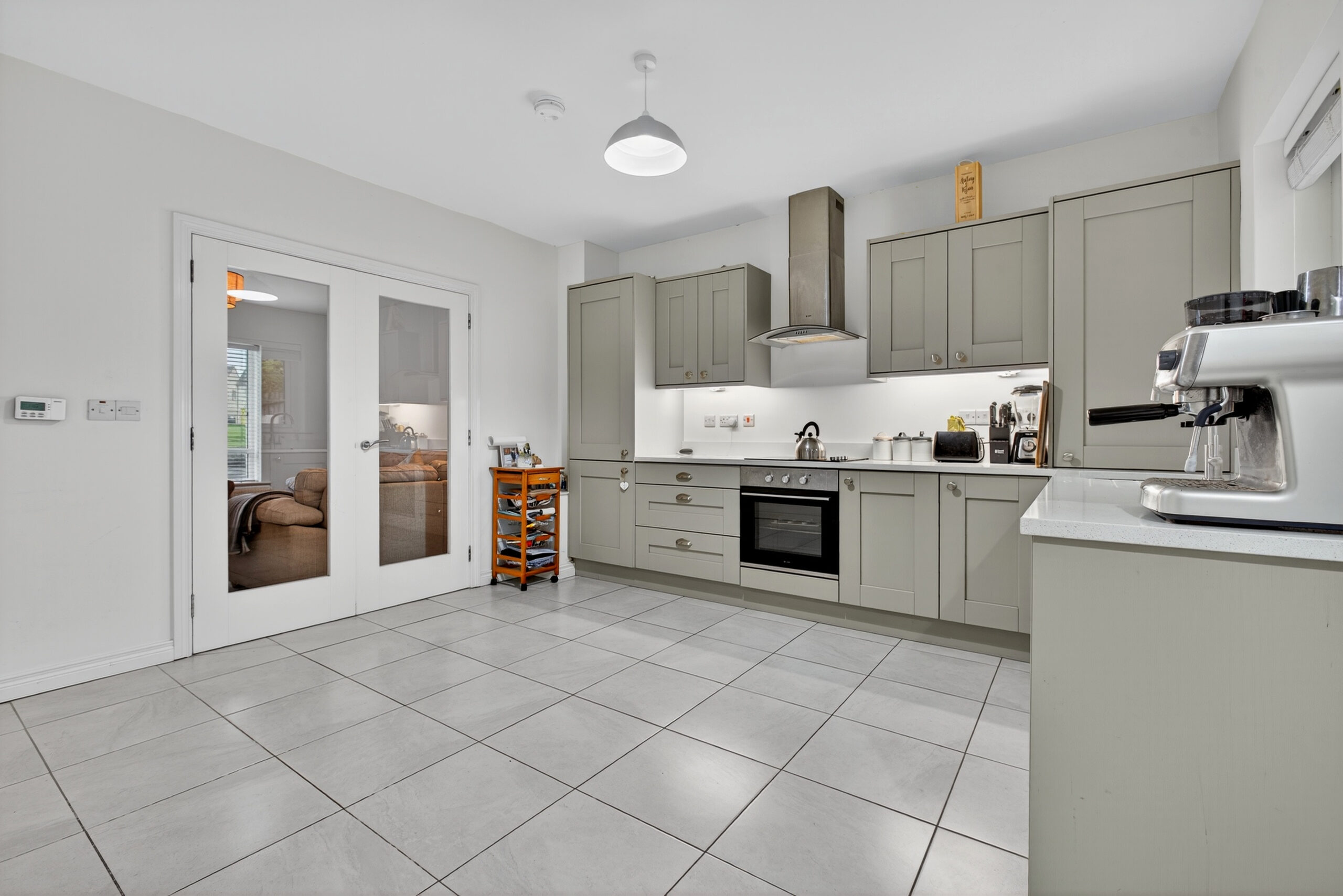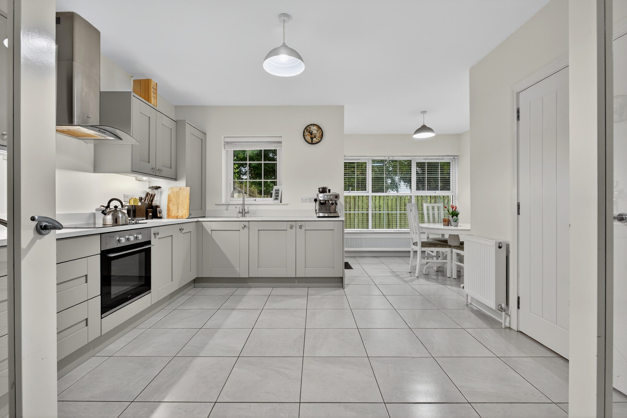 Range of shaker eye and low level unit with under unit lighting, Integrated fridge freezer, electric oven, hob, stainless steel and glass extractor hood, granite work tops with matching upstand, 1 1/4 stainless steel sink with mixer tap, open to dining area, radiator, tiled flooring, uPVC double glazed window to rear, door to utility room