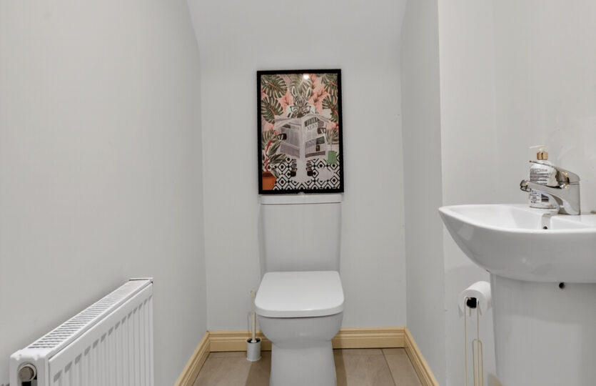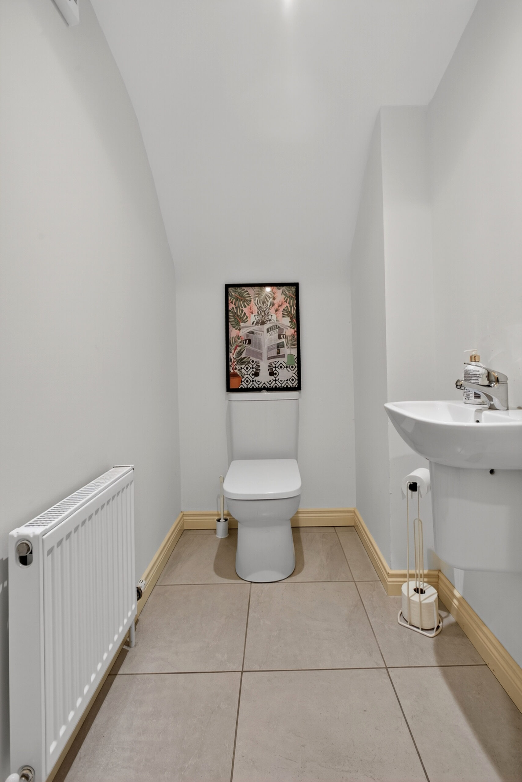 Low flush wc, wall mounted wash hand basin, tiled flooring, radiator