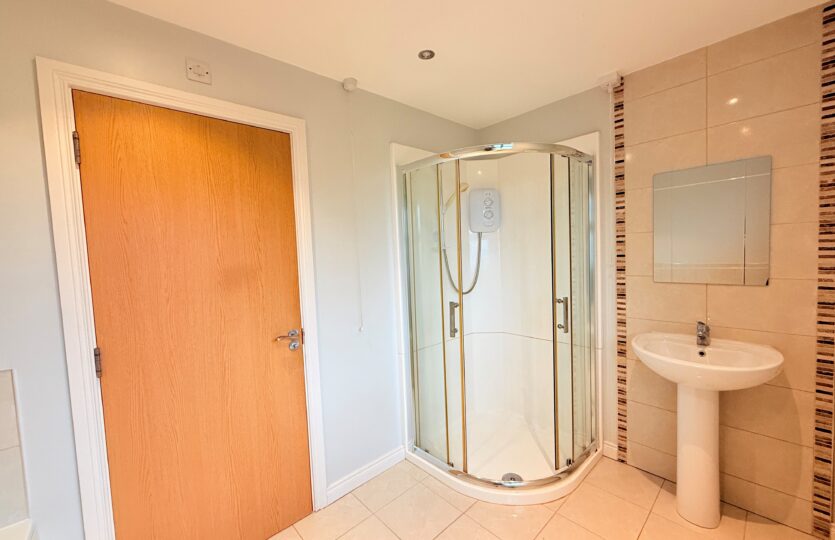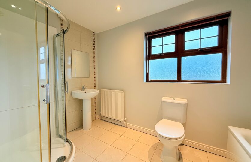 Four piece suite comprising of bath, pedestal wash hand basin, low flush wc, quadrant shower cubicle with Redring electric shower, tiled flooring, part tiled walls, radiator, uPVC double glazed window to rear, recessed LED ceiling lighting